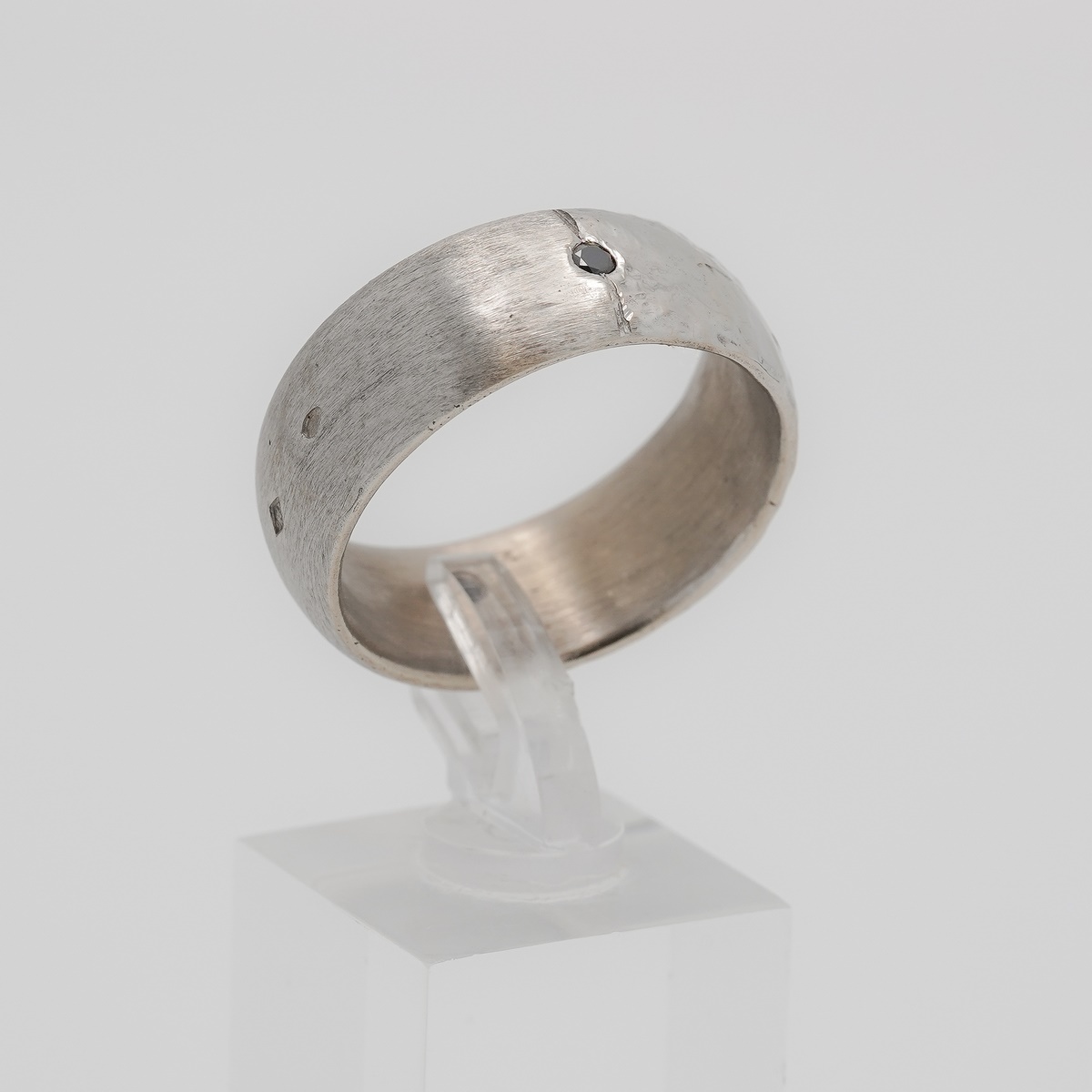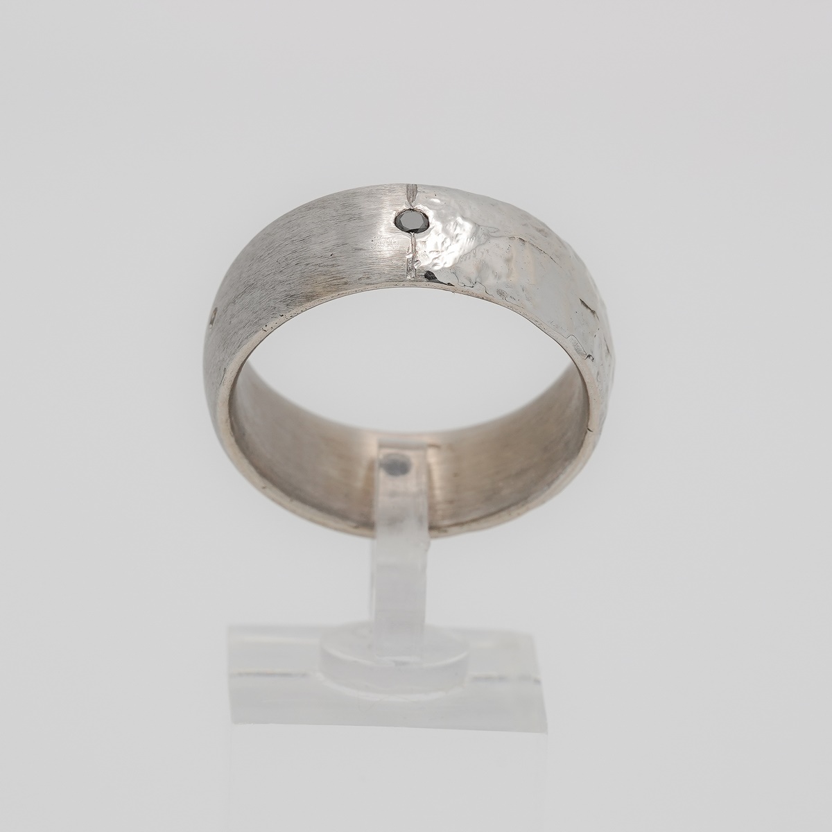 Martelée jusqu’à l’égo. Libérée, battre le fer pendant qu’il est chaud ! Pour une alliance en or blanc et diamants noirs.