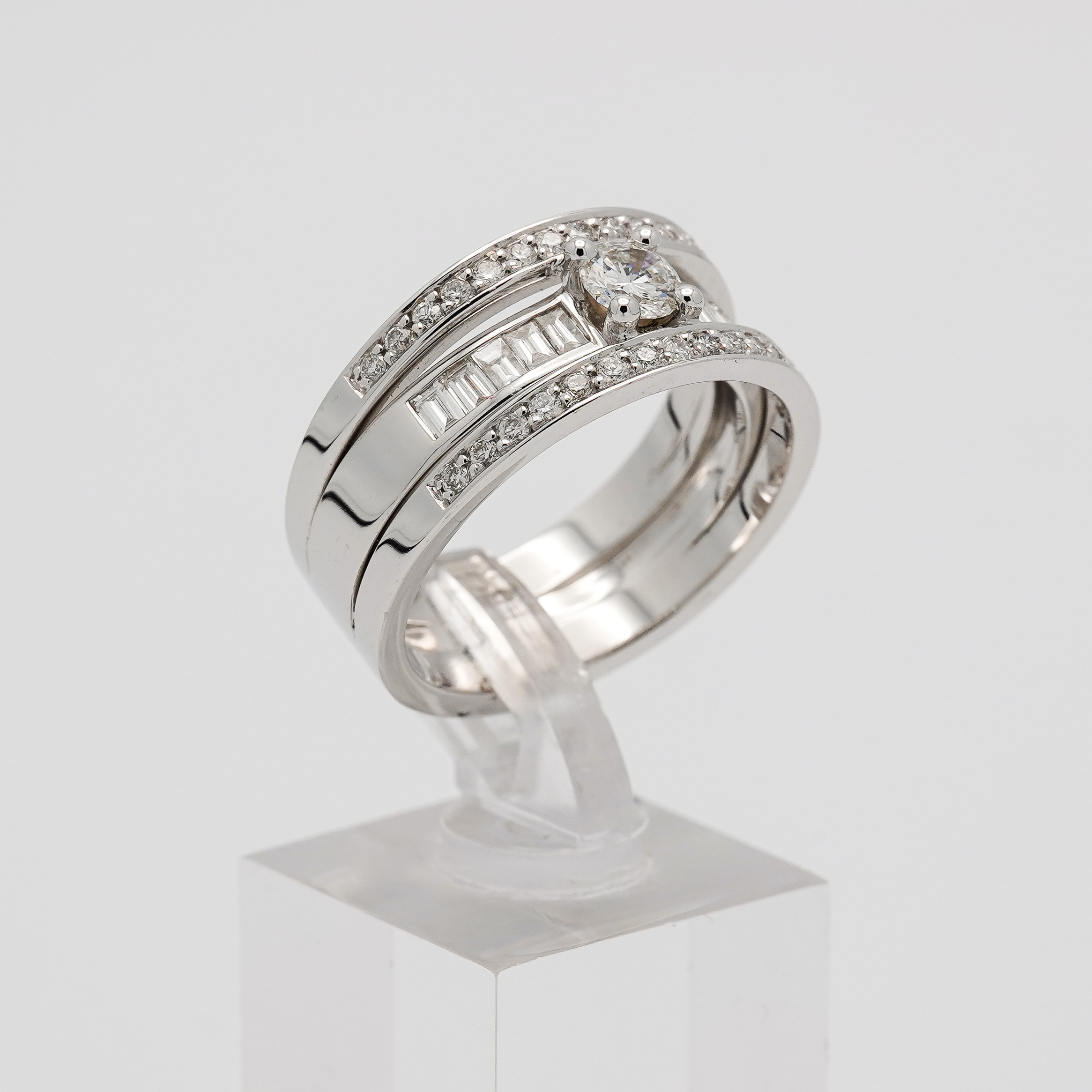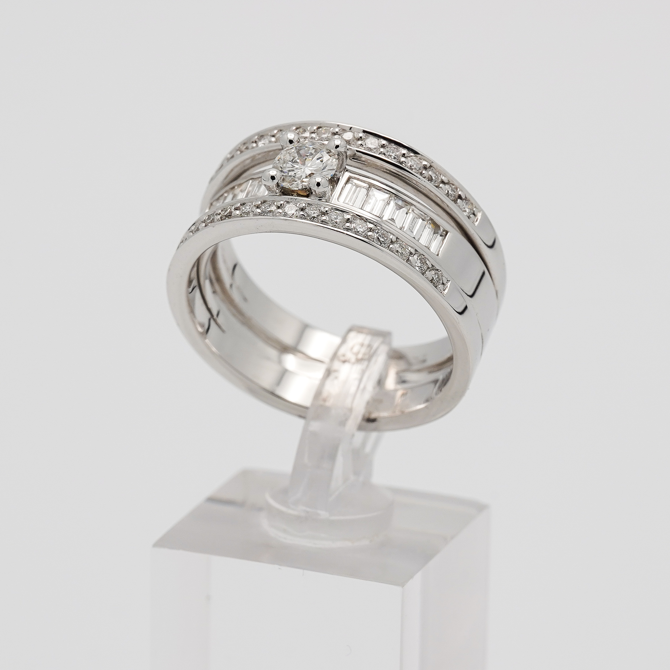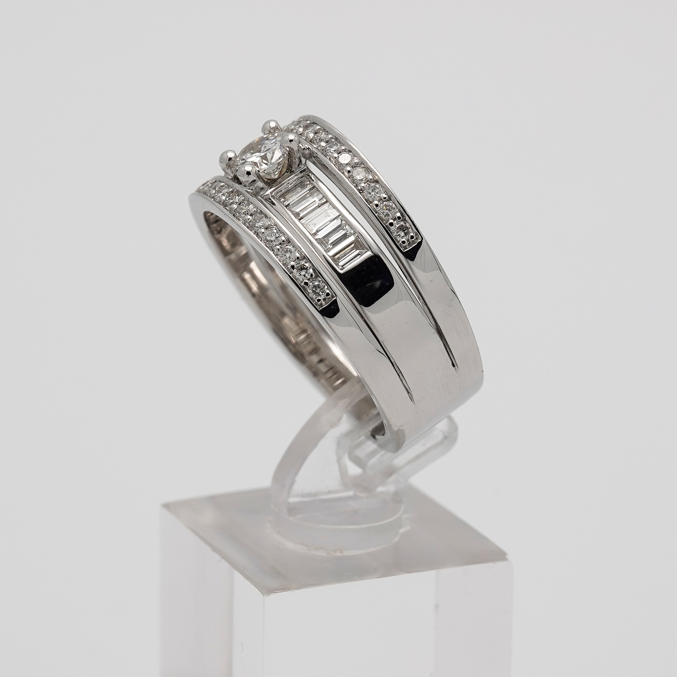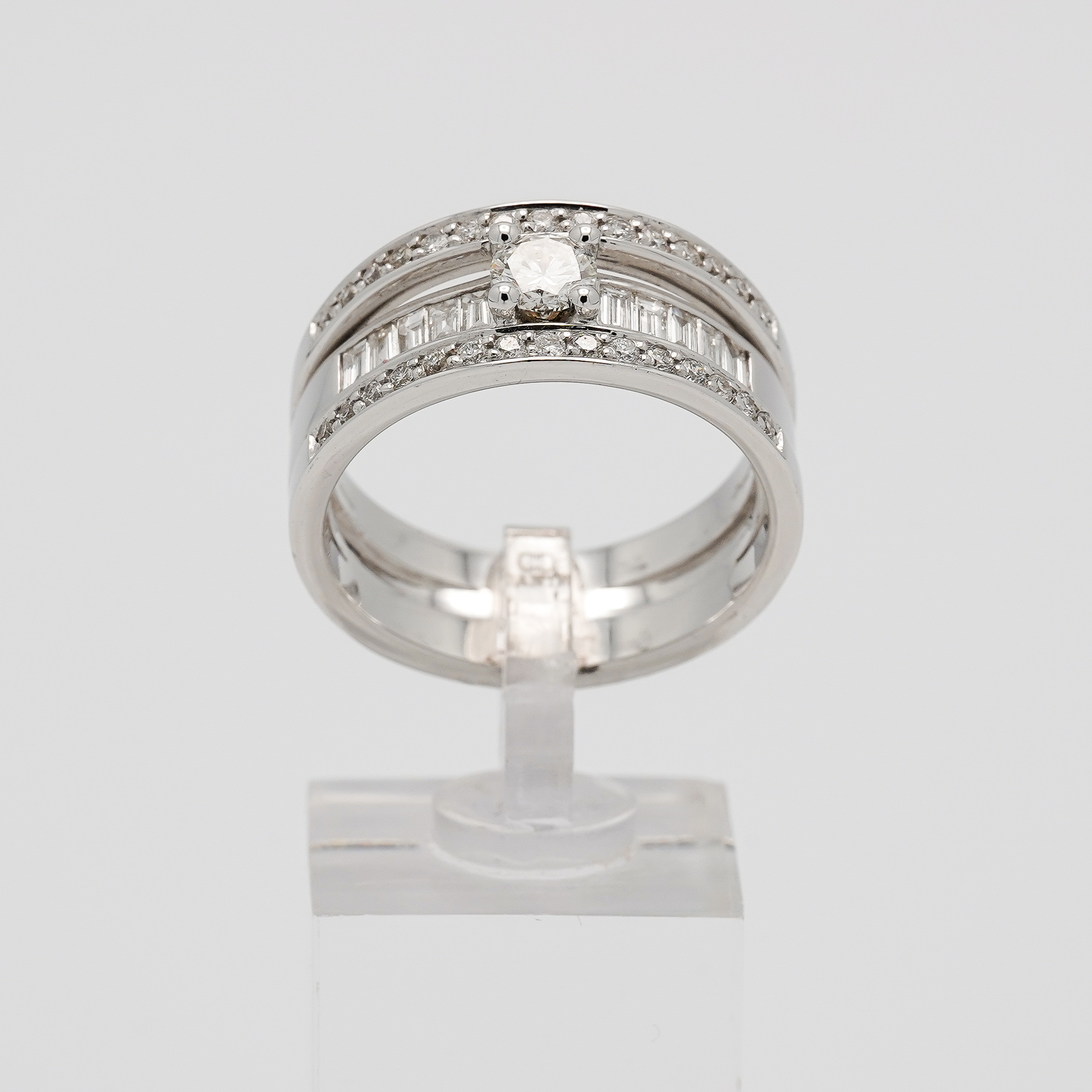 Bague or blanc 750 millièmes avec un diamants central, 10 diamants baguette et 30 diamants serti grains sur les branches extérieures.