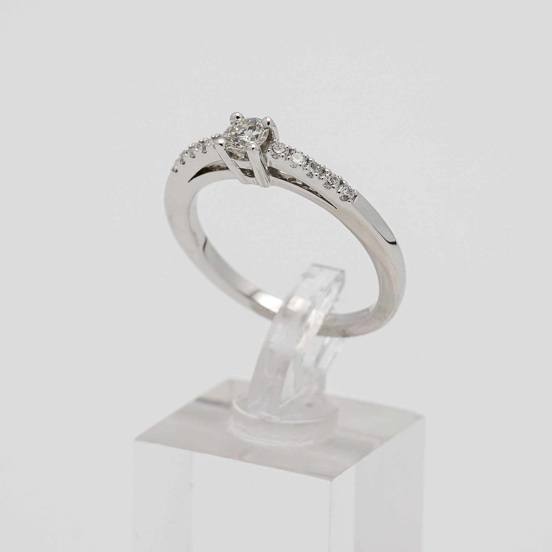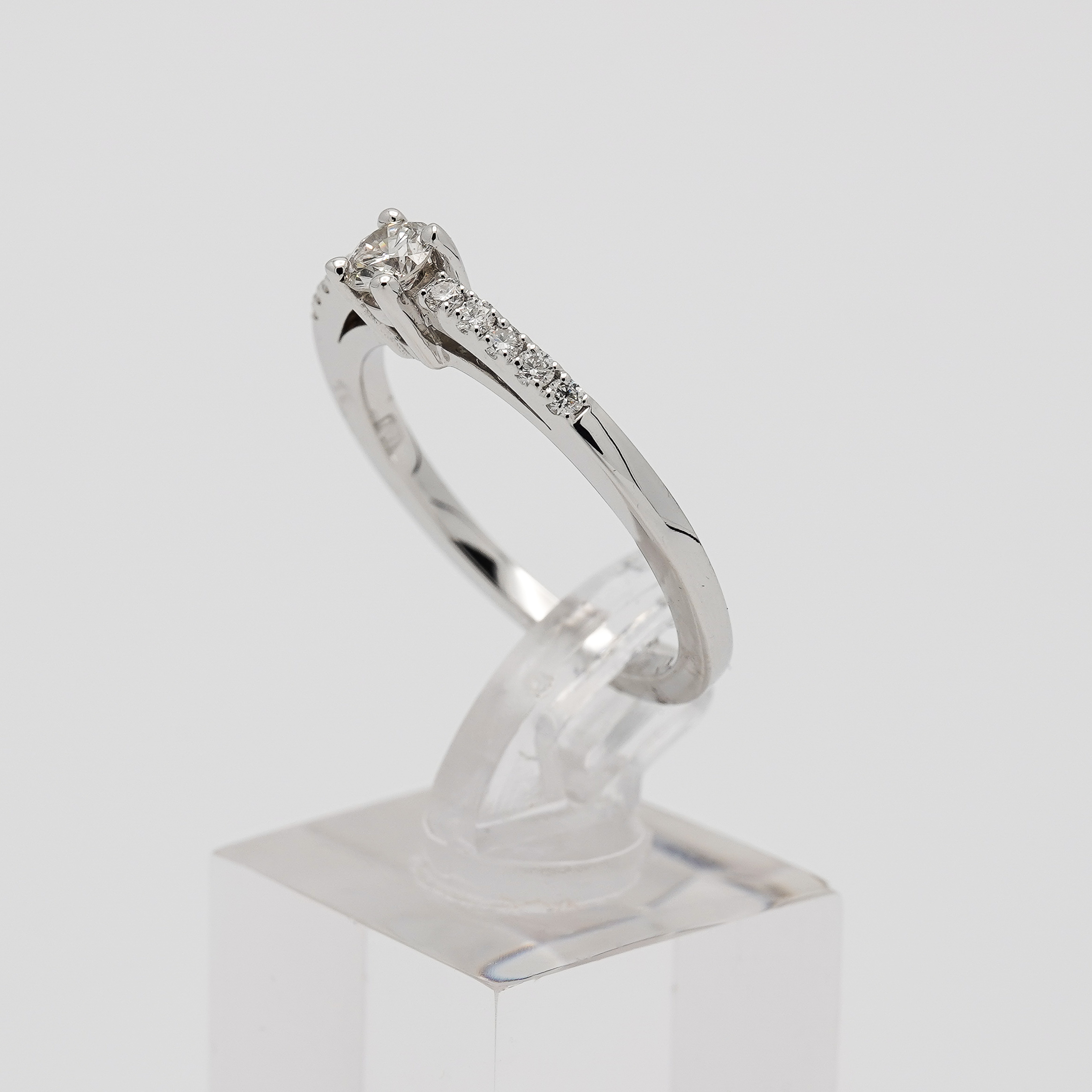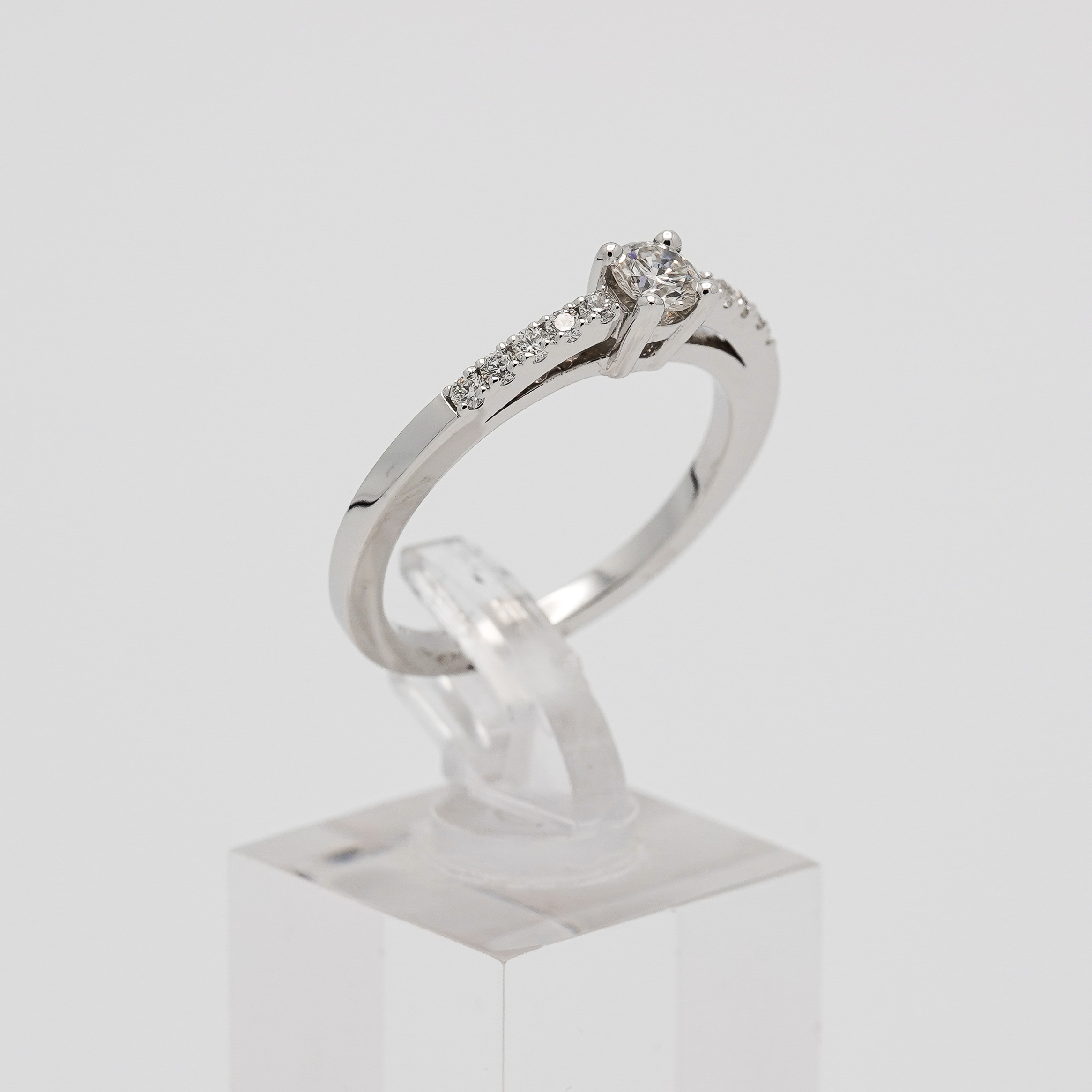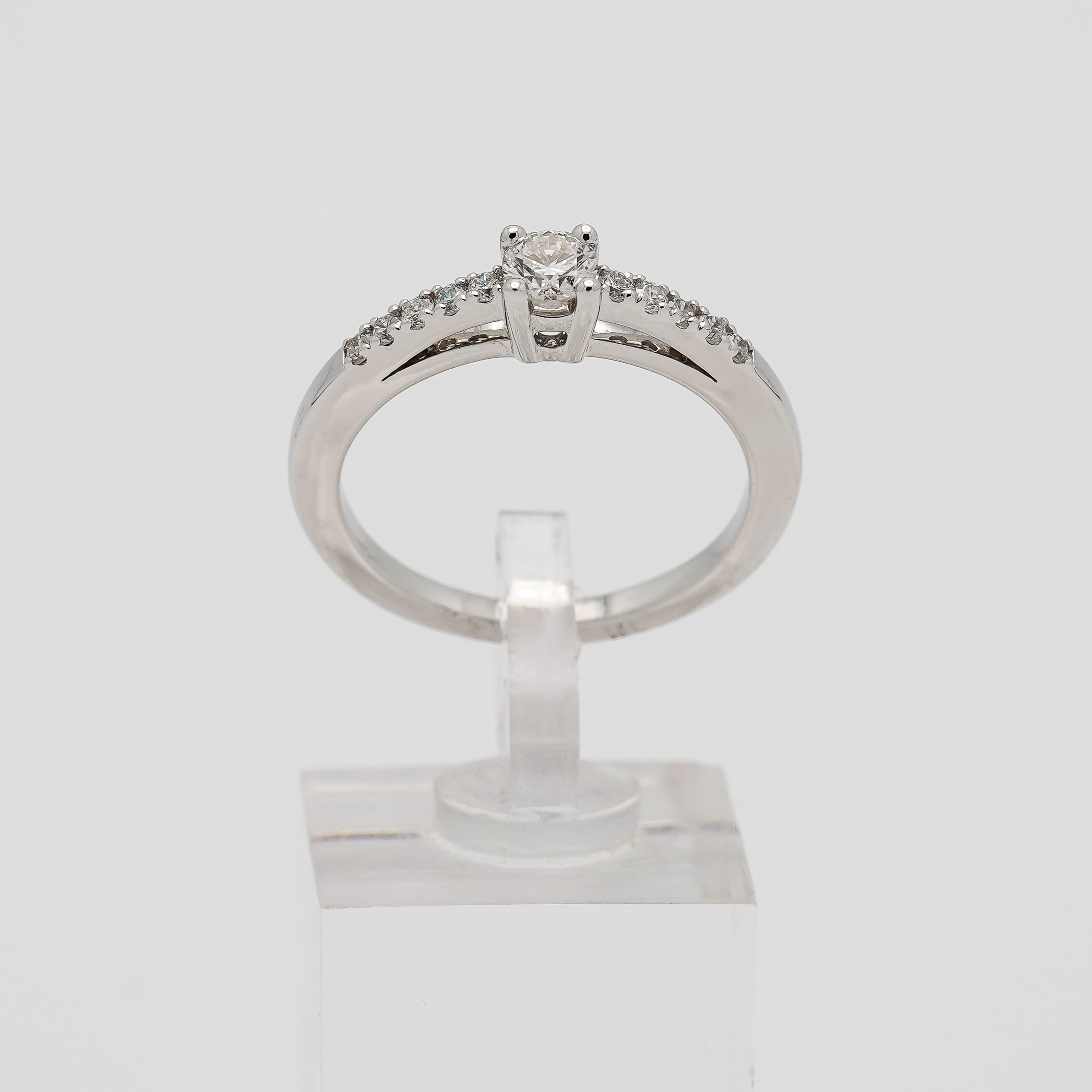 Bague or blanc 750 millièmes avec un diamant central serti 4 griffes et 10 diamants sertis sur le haut de corps.