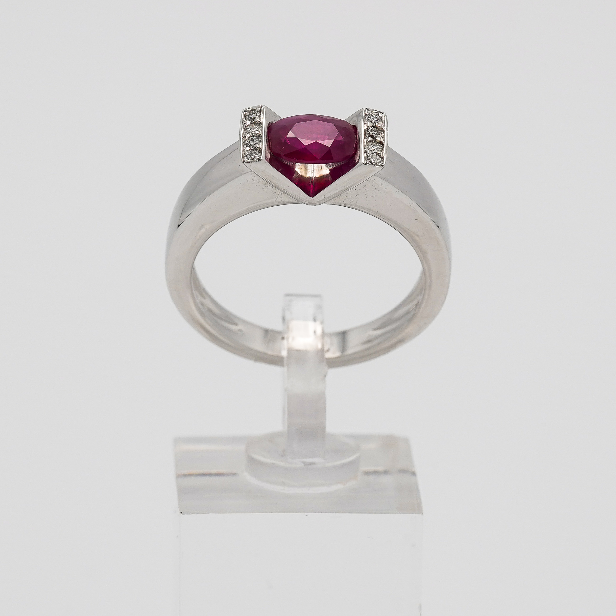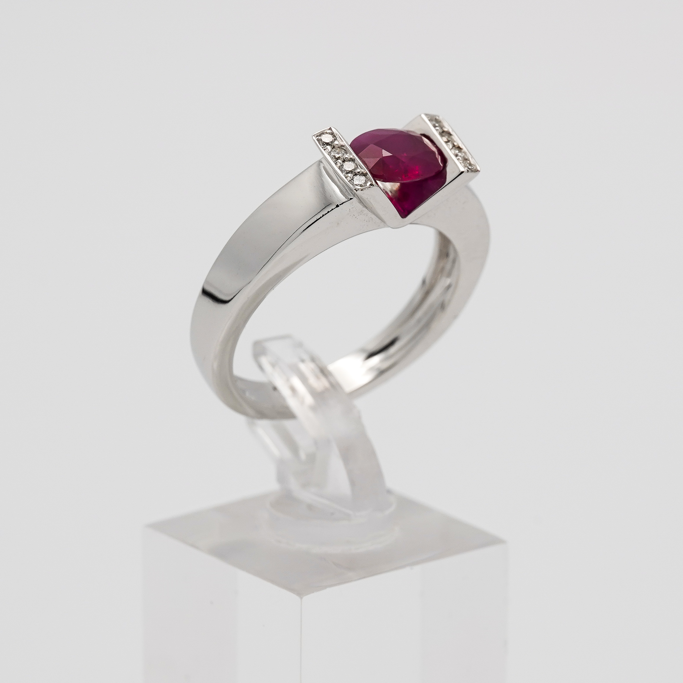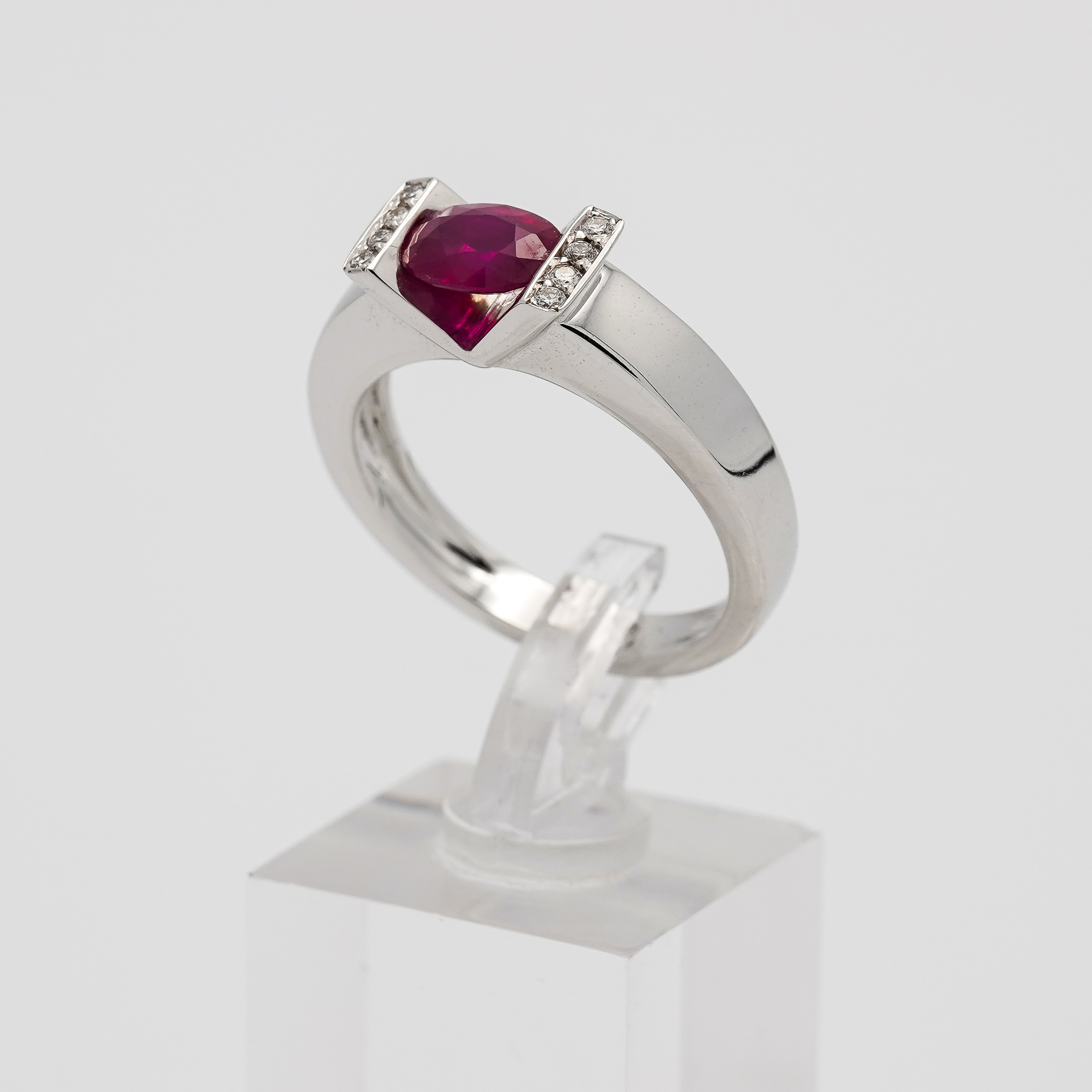 Bague or blanc 750 millièmes avec un rubis ovale serti rail et 8 diamants serti grains.