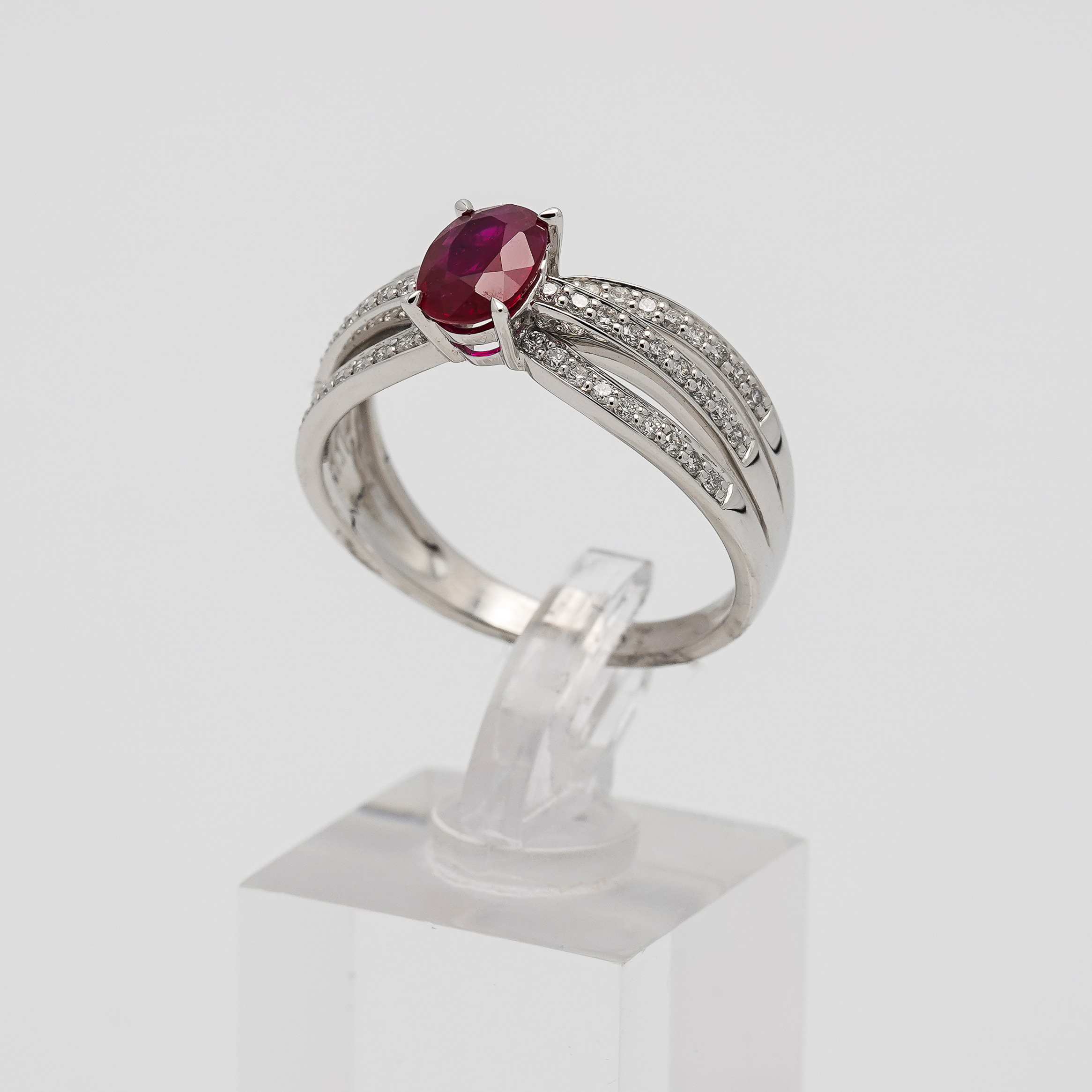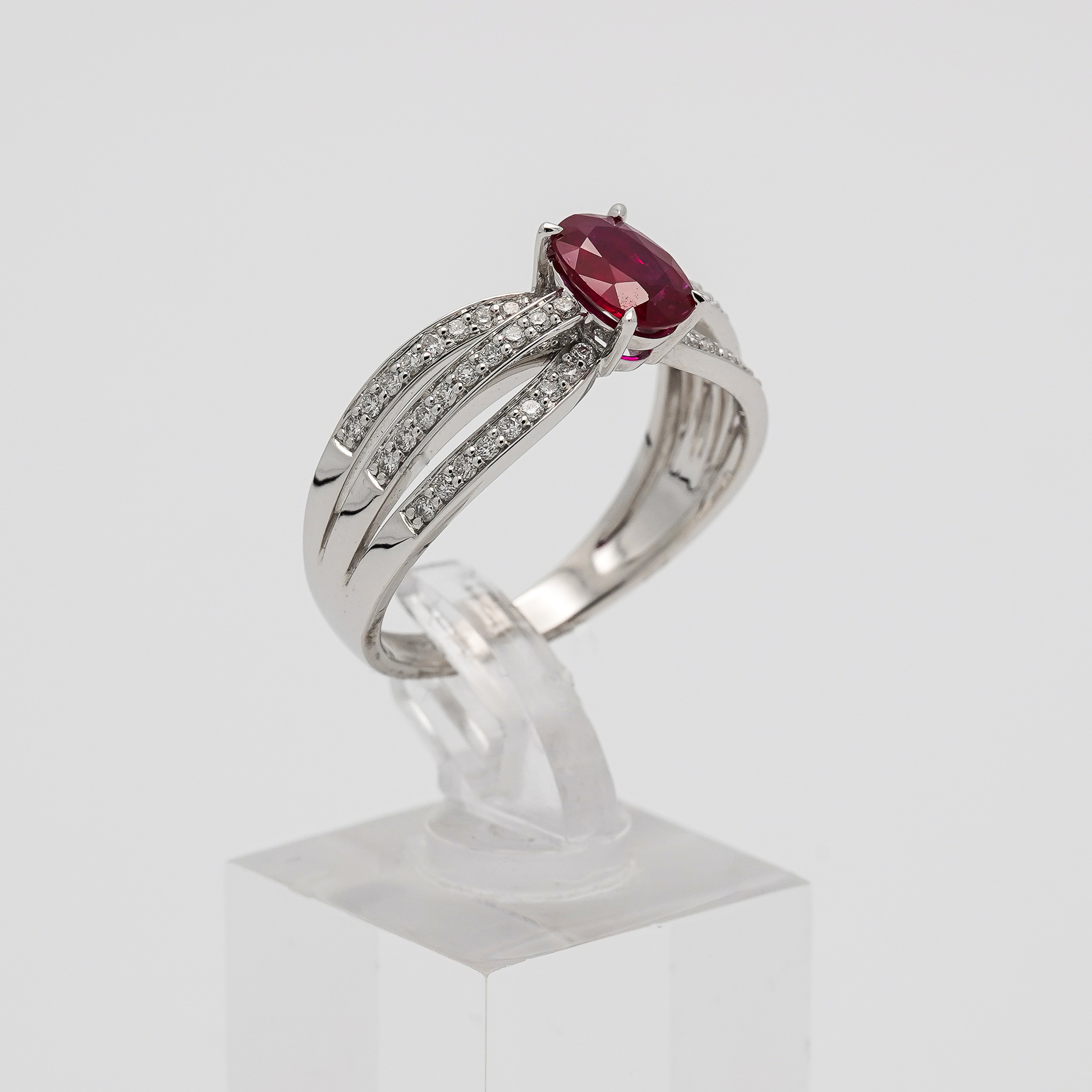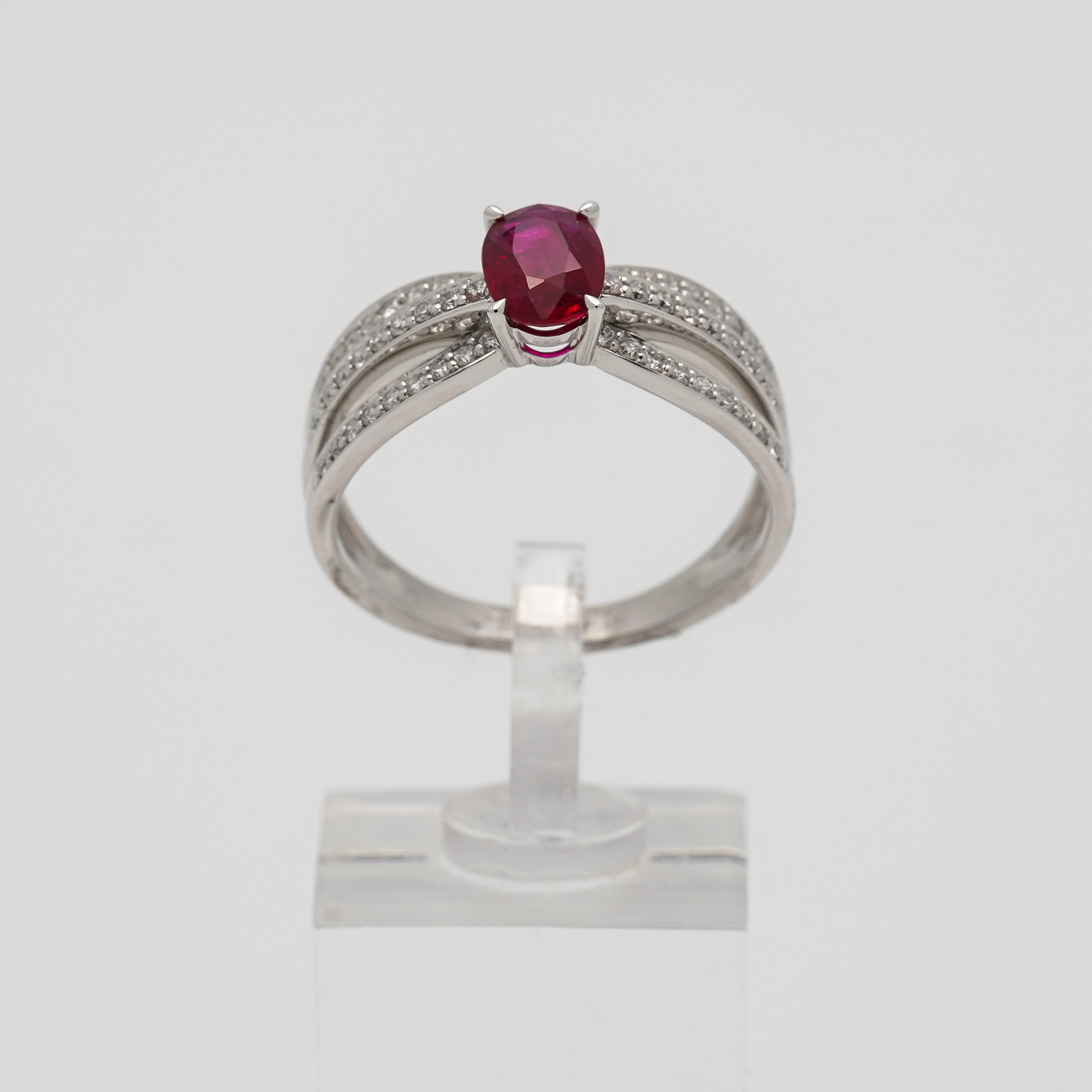 Bague or blanc 750 millièmes avec un rubis ovale serti 4 griffes et 54 diamants serti grains.