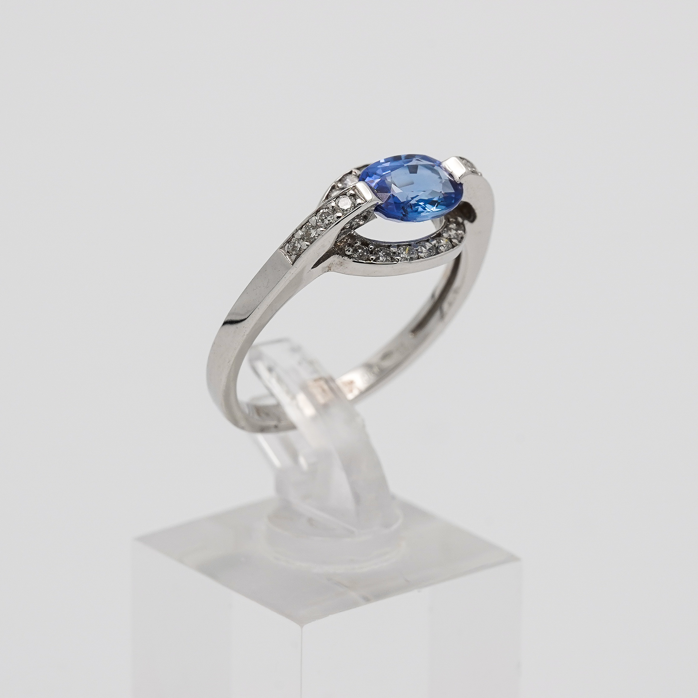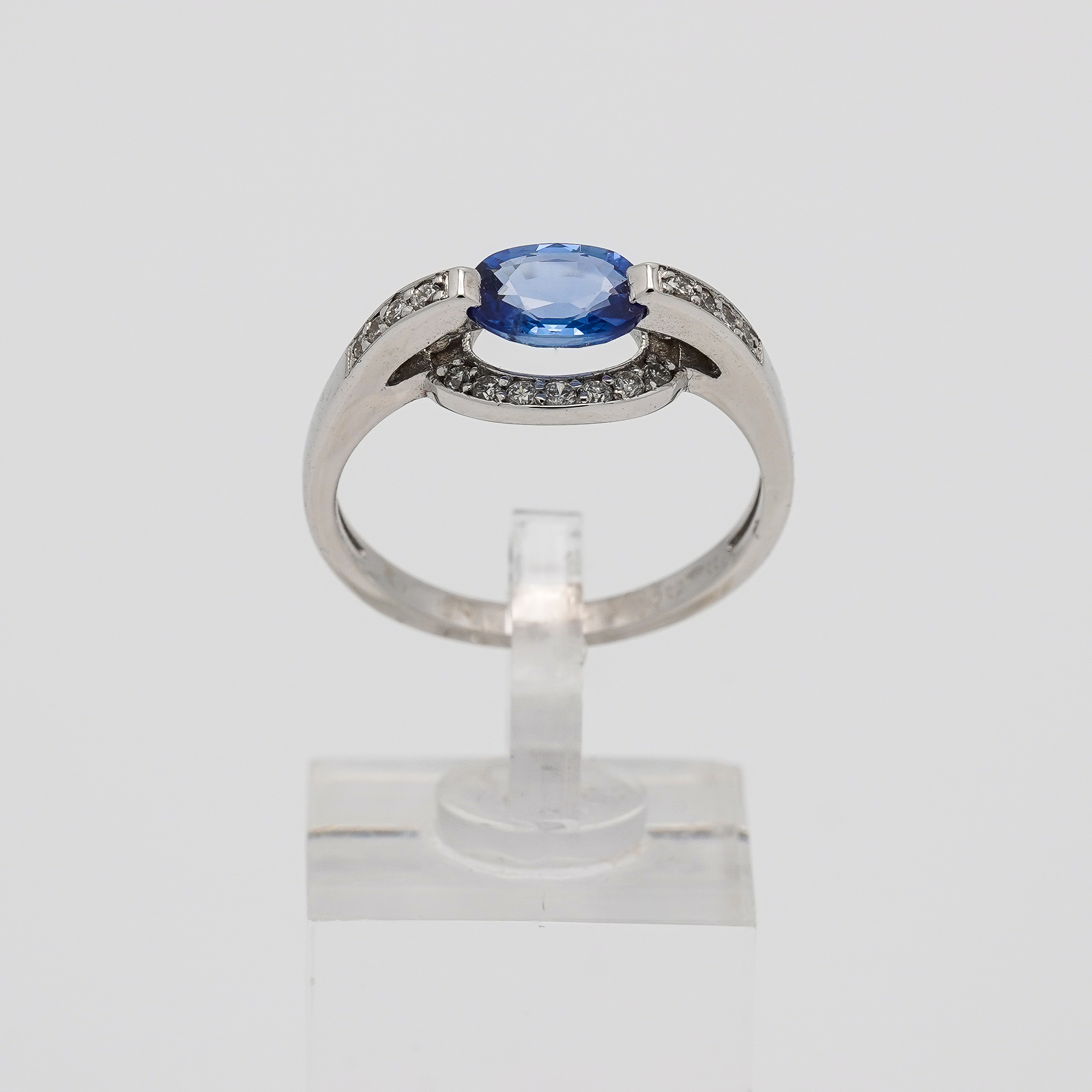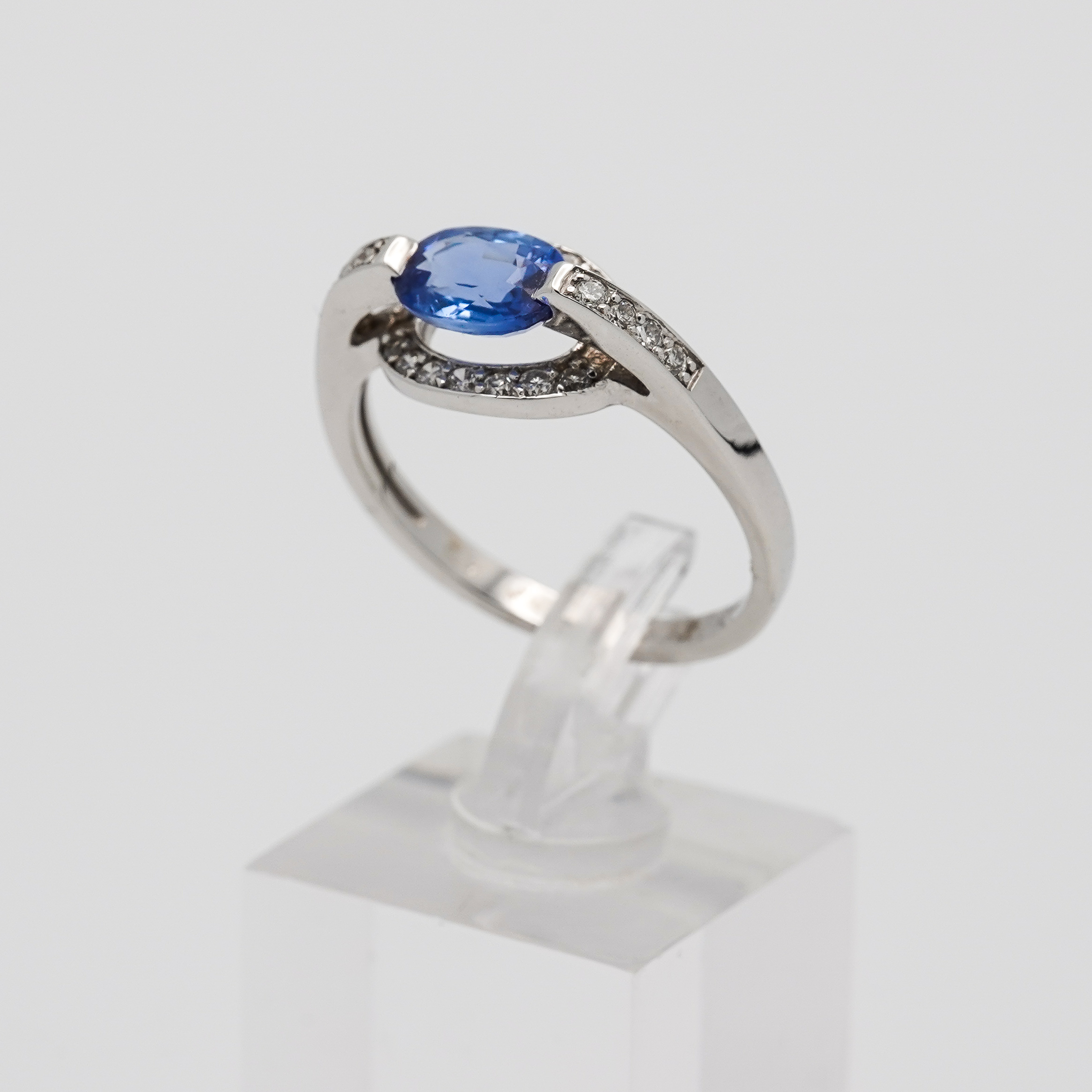Bague or blanc 750 millièmes avec un saphir bleu ovale et 22 diamants.