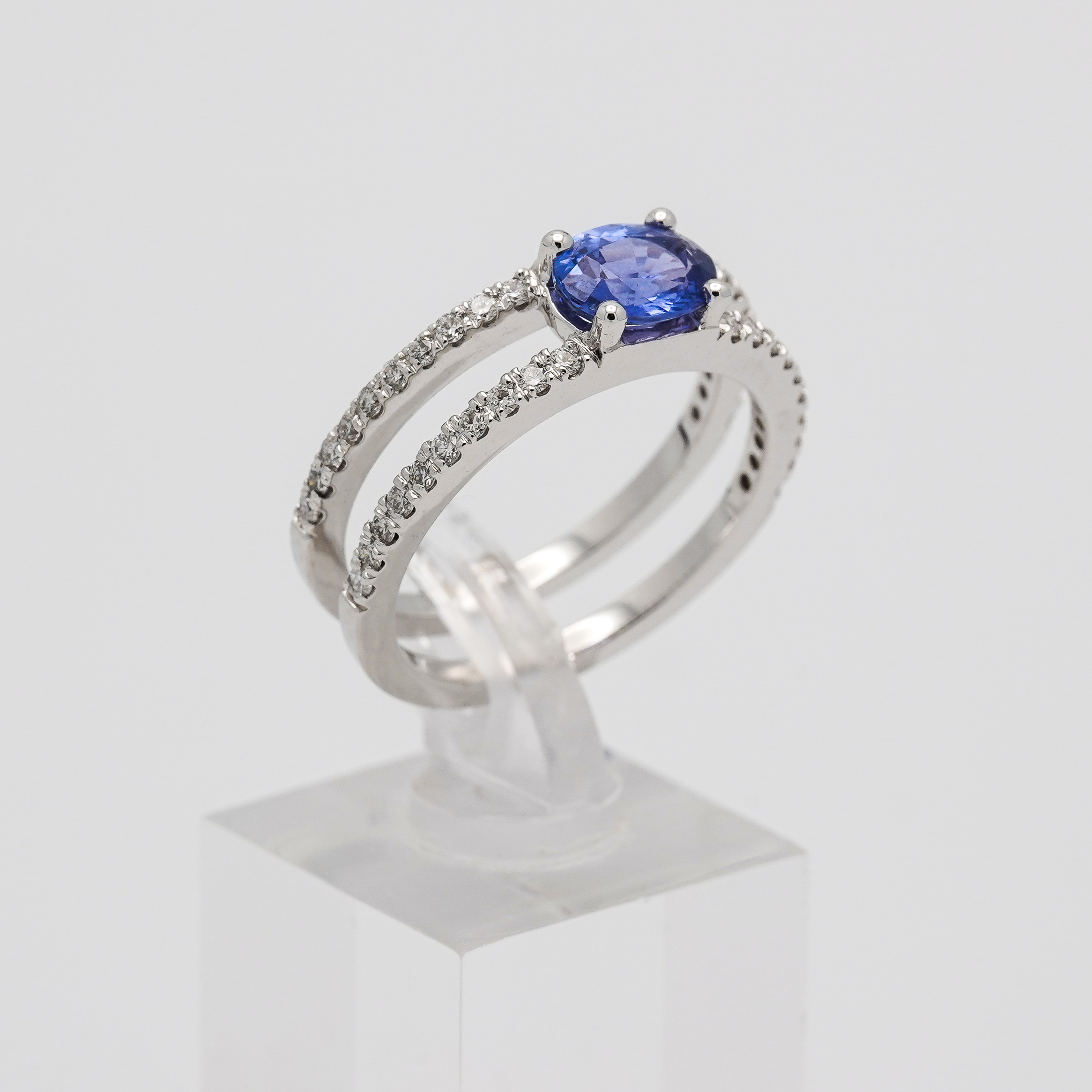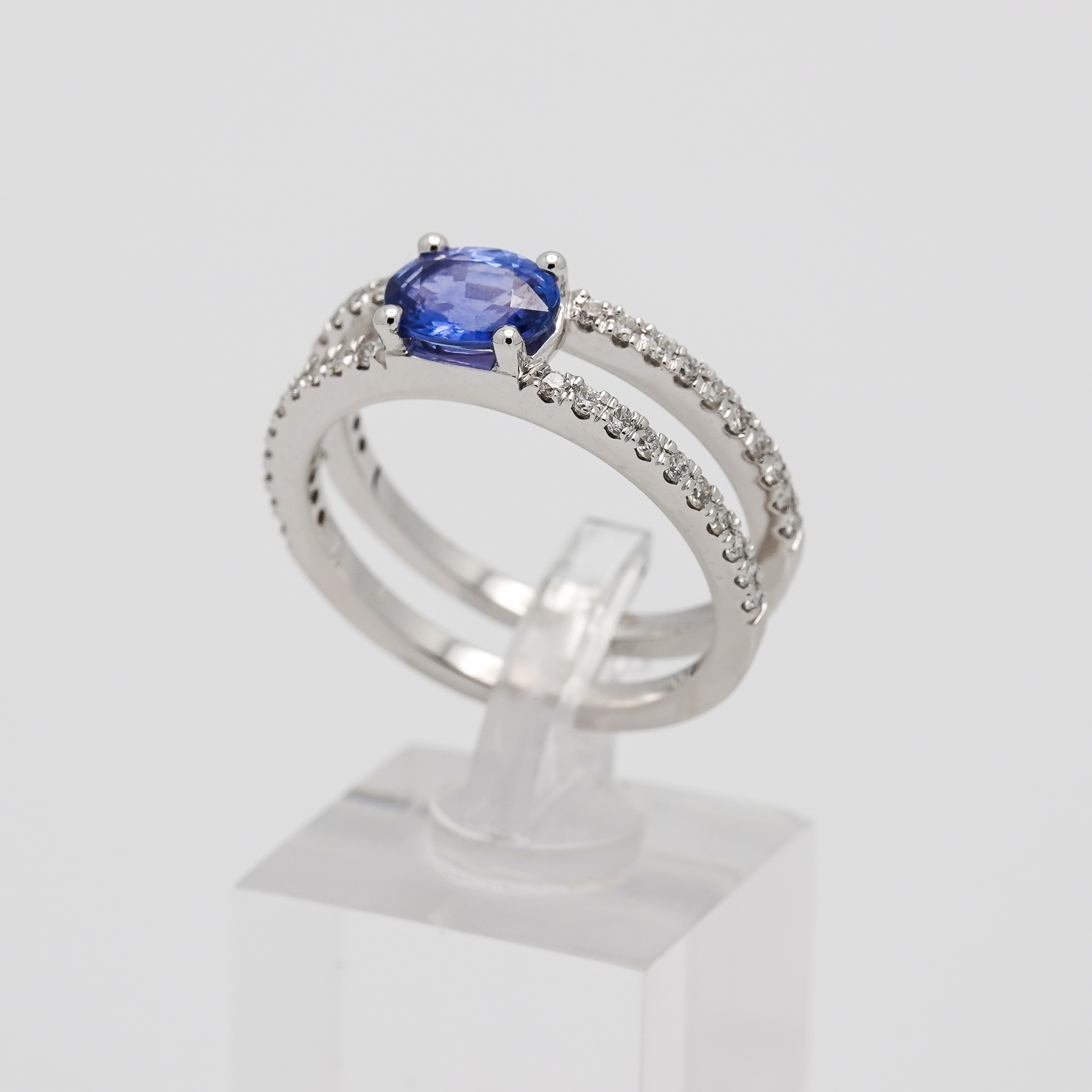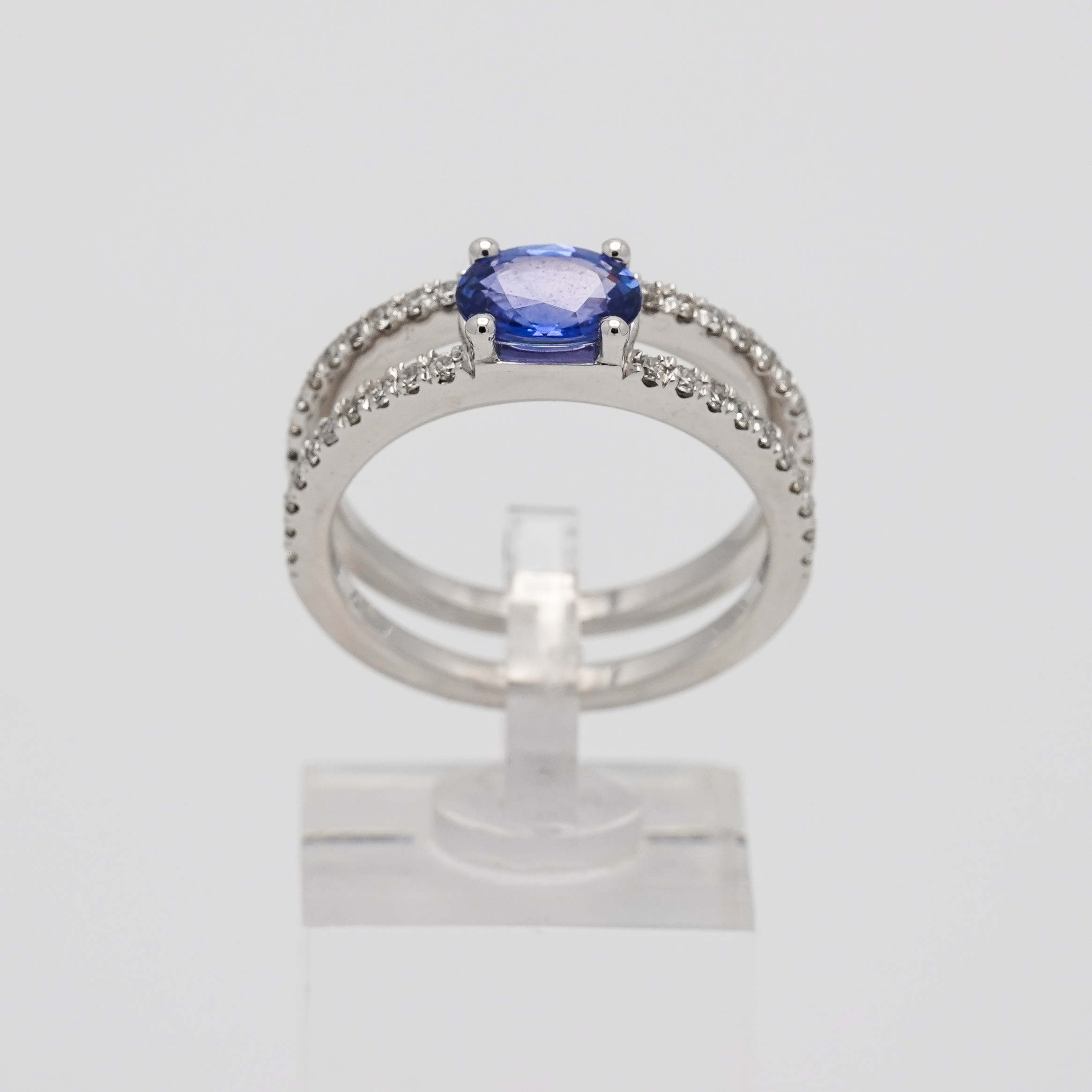 Bague en or blanc 750 millièmes avec un saphir bleu serti 4 griffes et 40 diamants serti 4 griffes sur les branches.