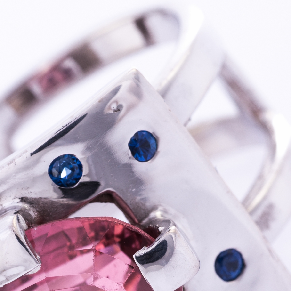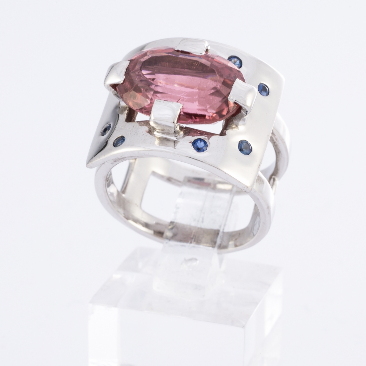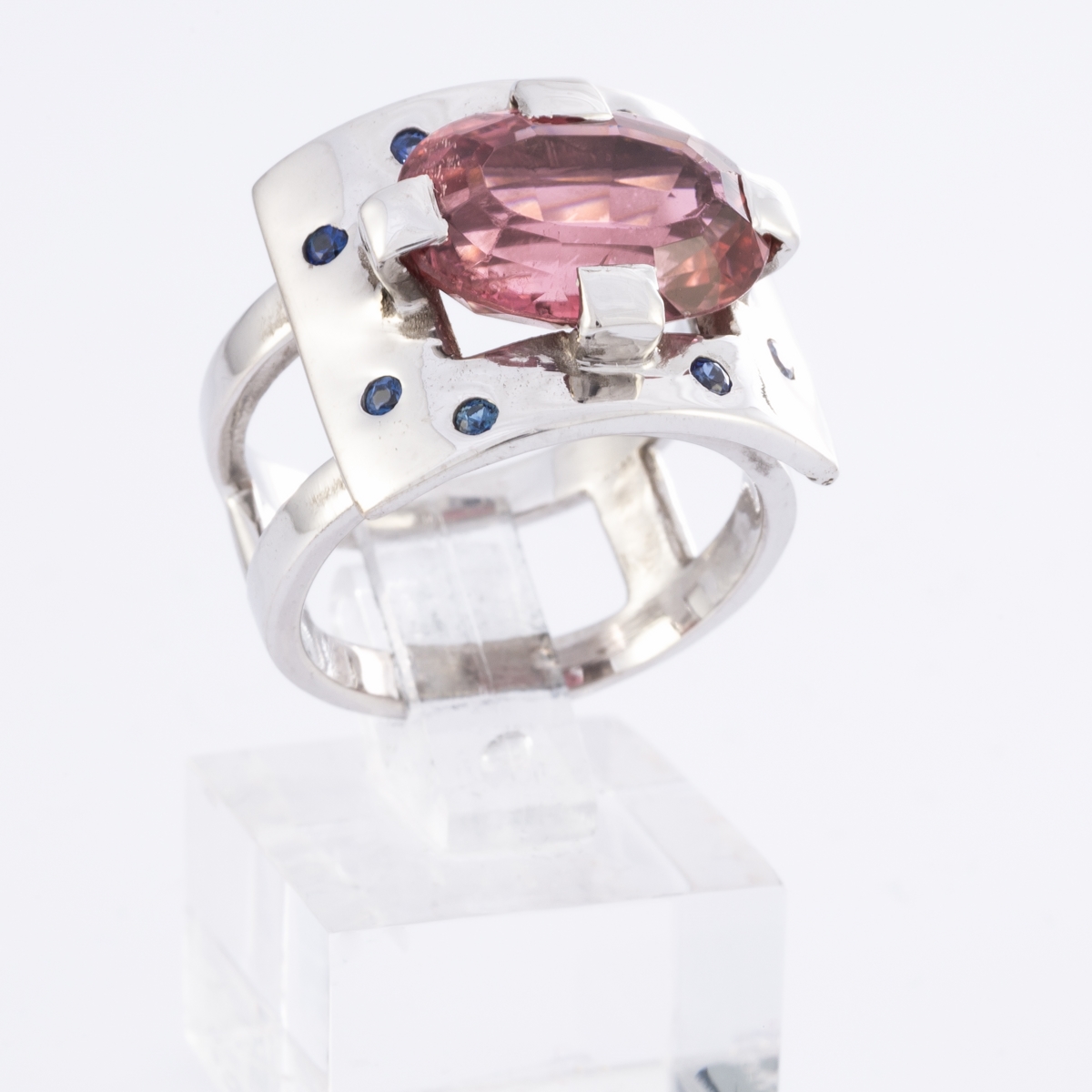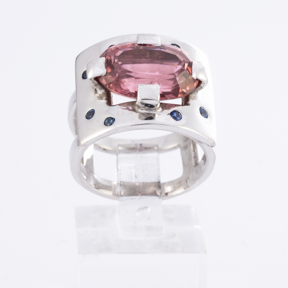 Bague or blanc avec en pierre de centre une tourmaline ovale serti quatre griffes et en entourage huit saphirs bleus serti masse.