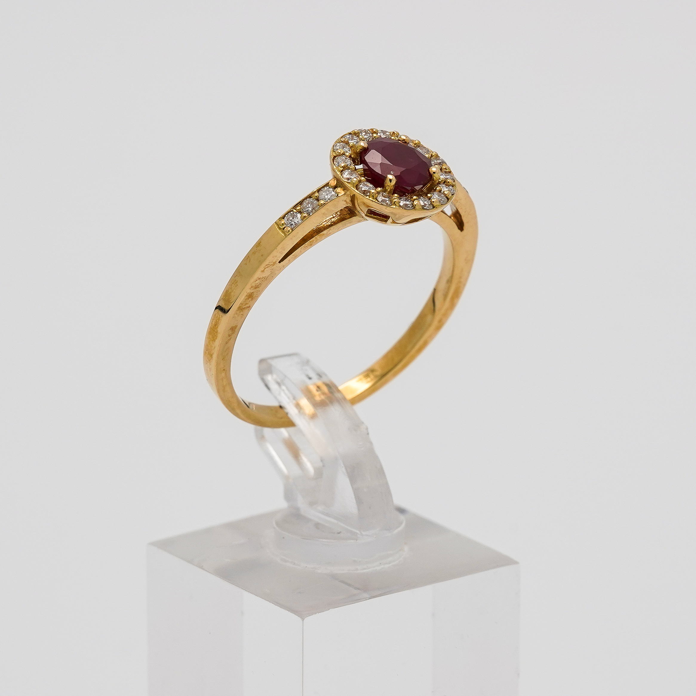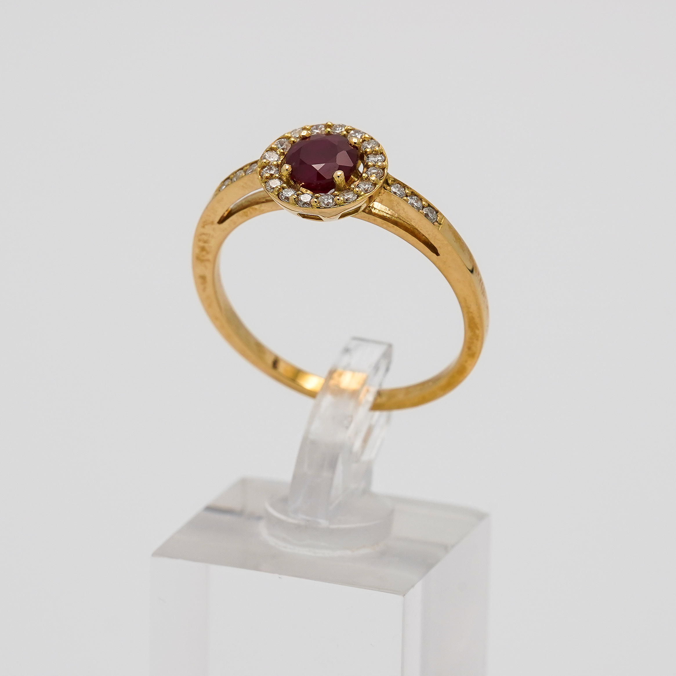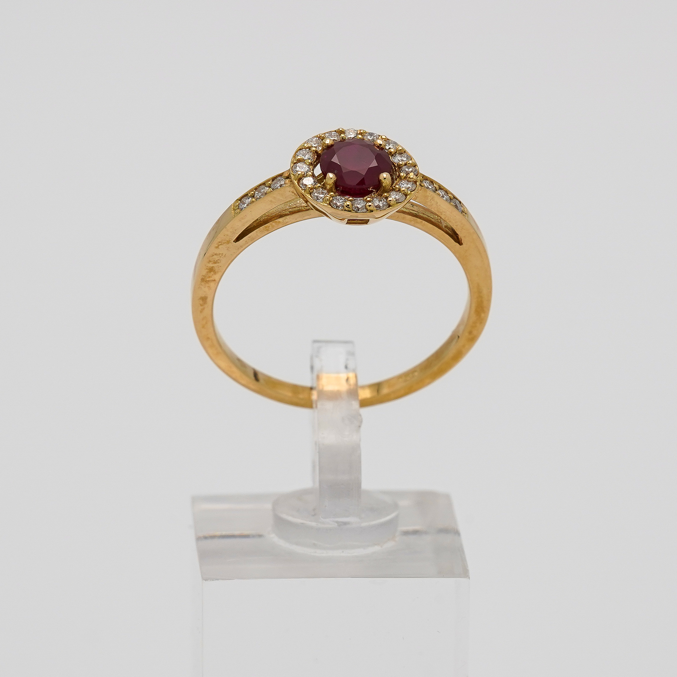 Bague or jaune 750 millièmes avec un rubis rond serti 4 griffes et 22 diamants en entourage serti grains.