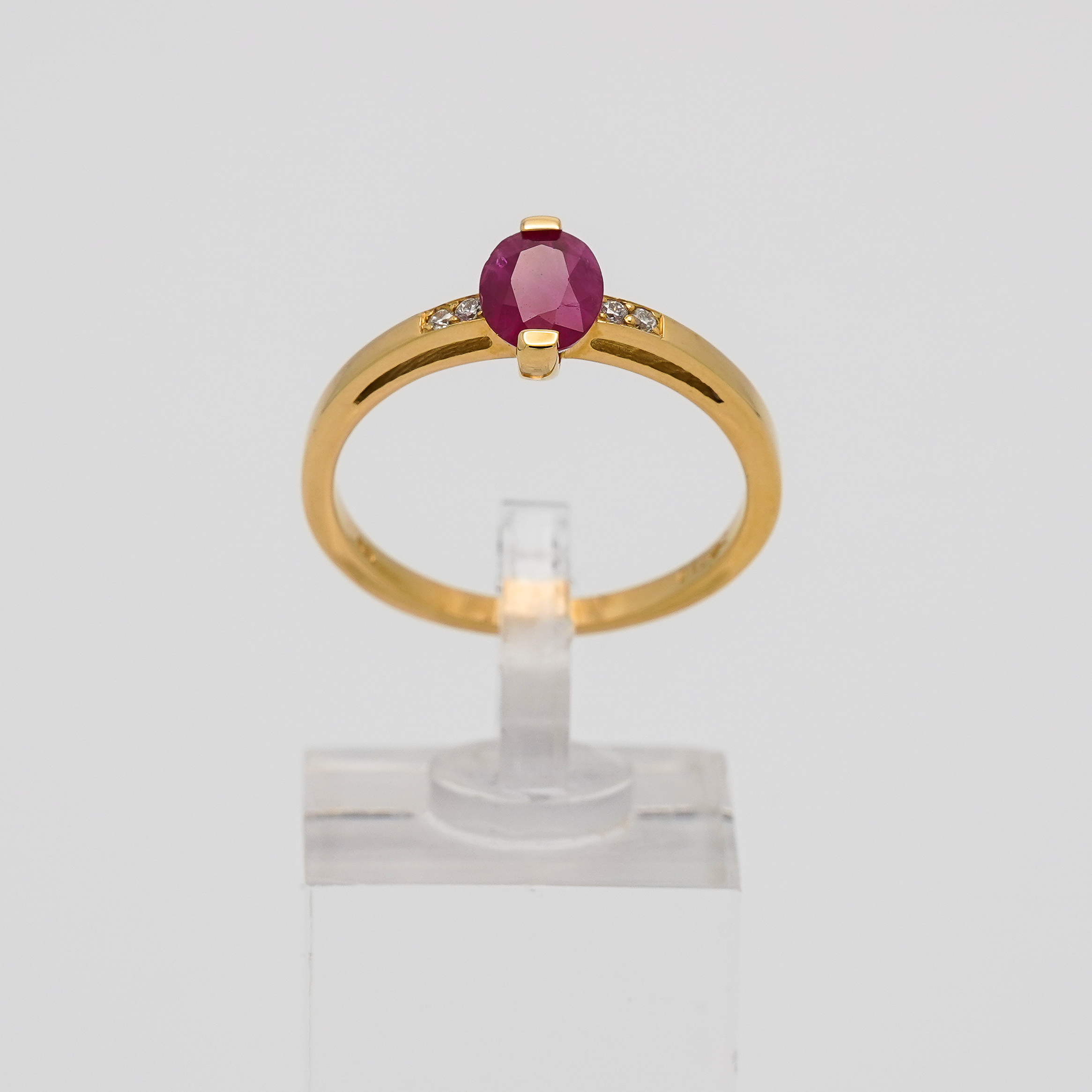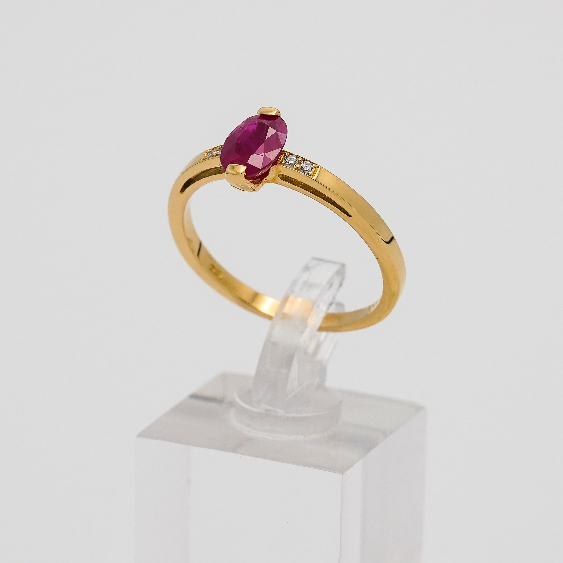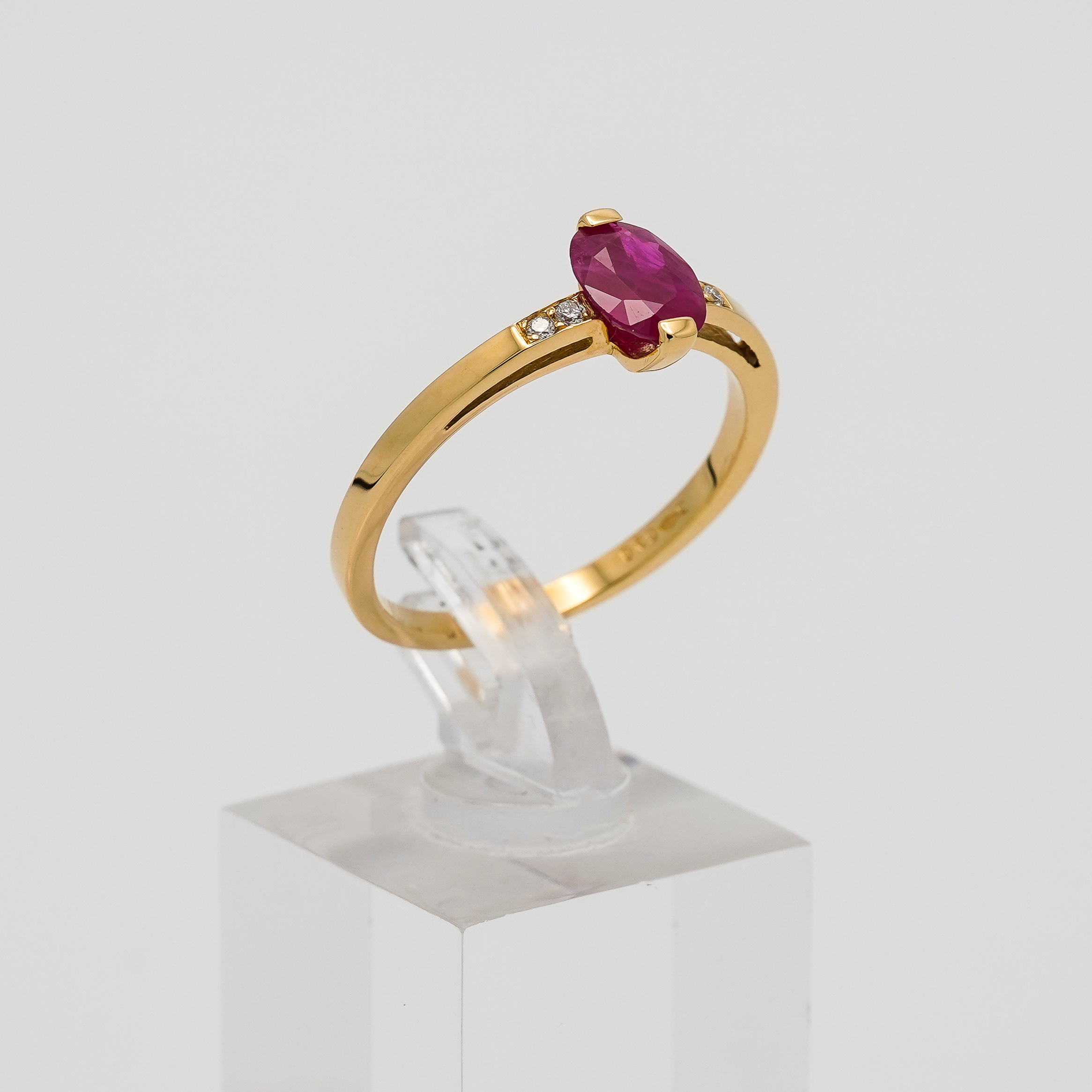 Bague or jaune 750 millièmes avec un rubis et 4 diamants sur le haut de corps.