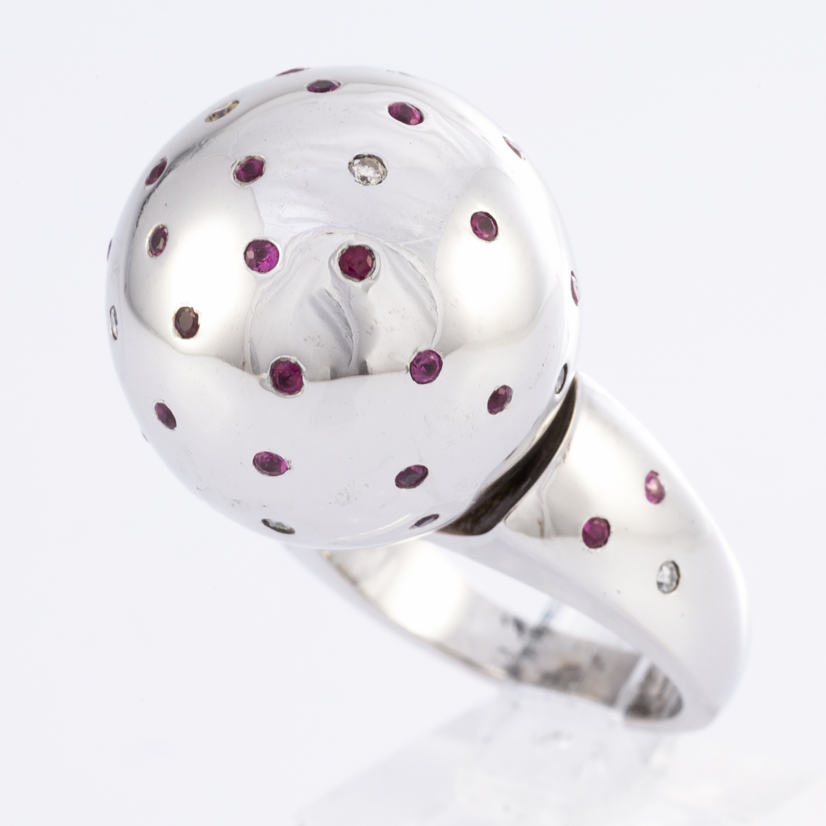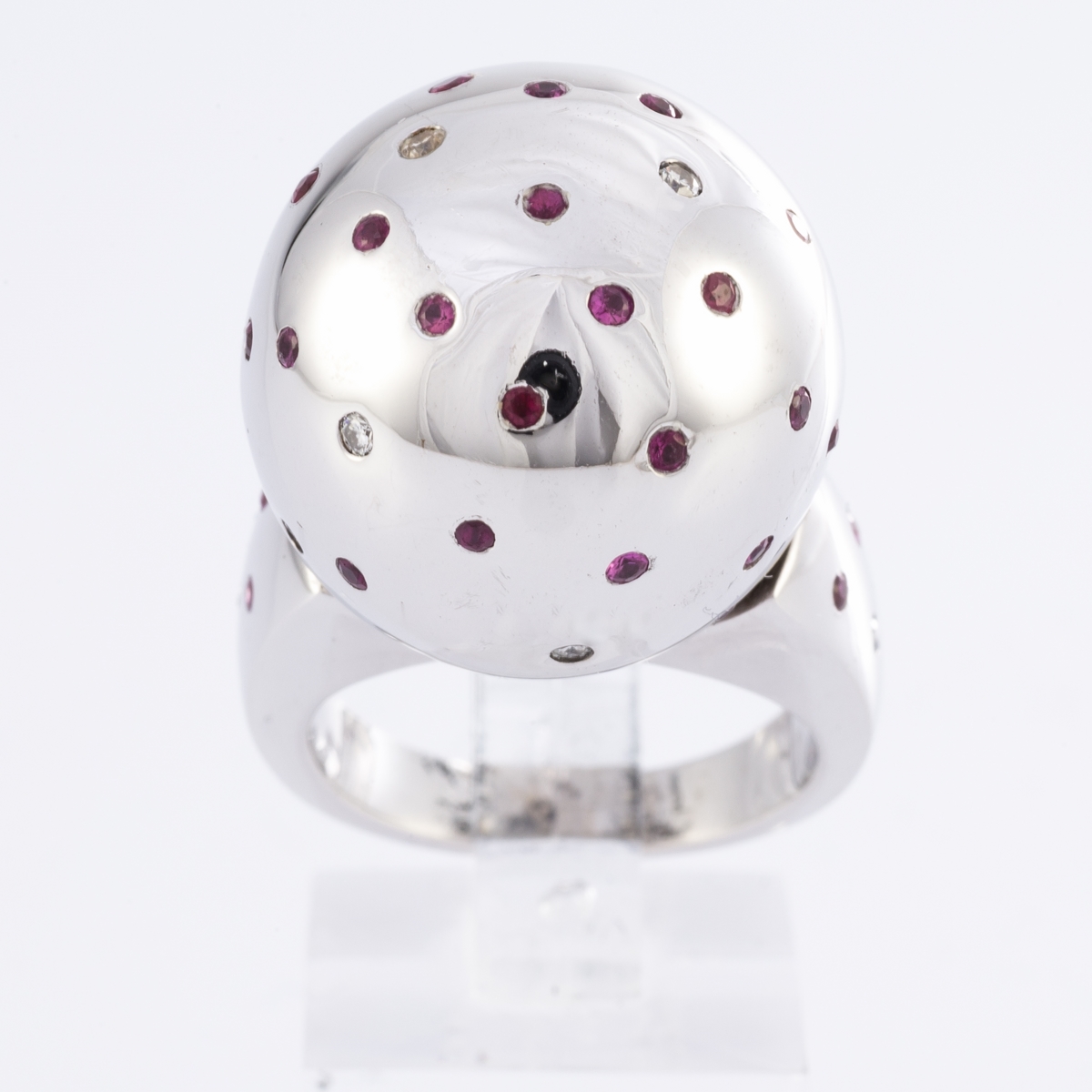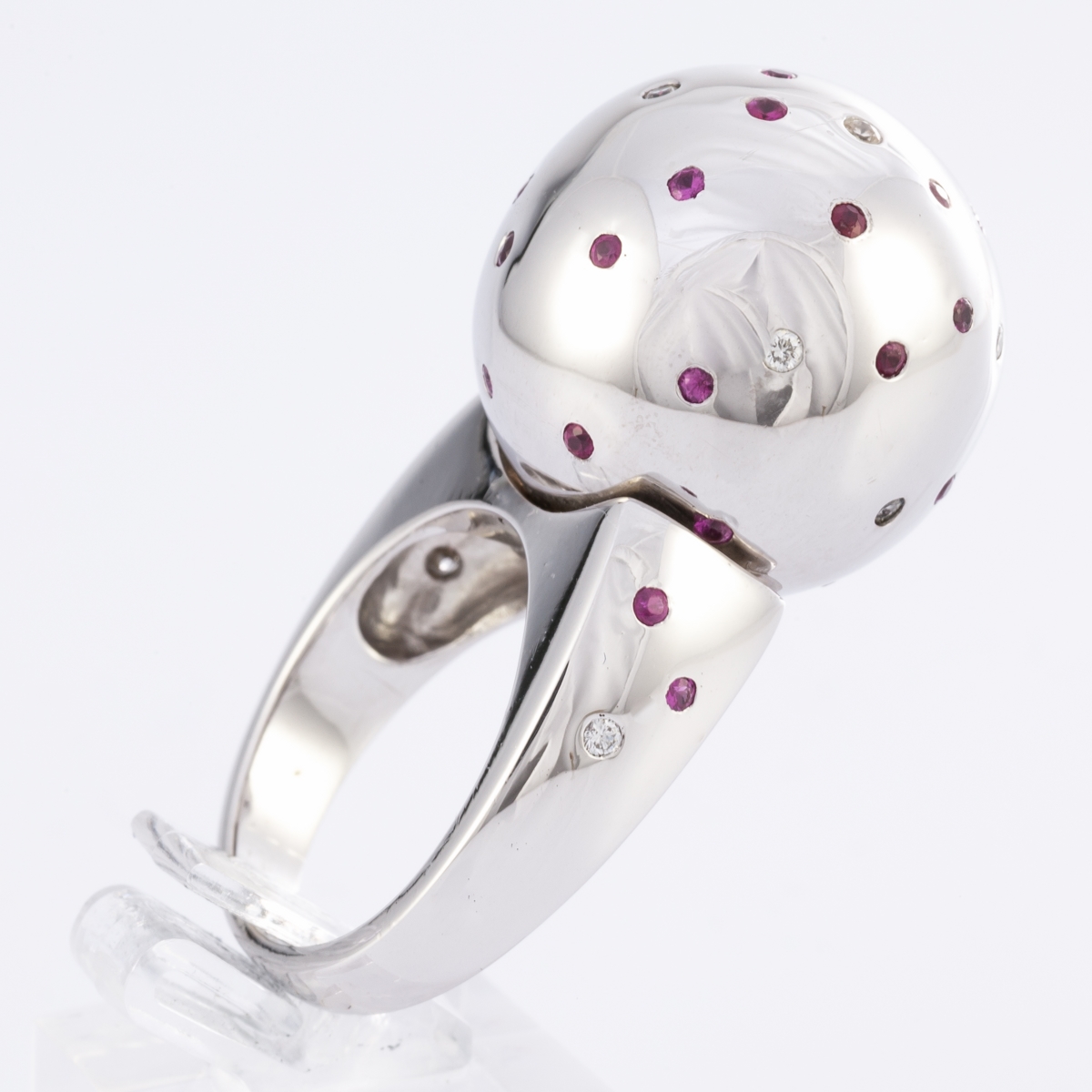 Bague or gris articulée, sphère sertie de rubis, saphirs roses et diamants sertissage masse.