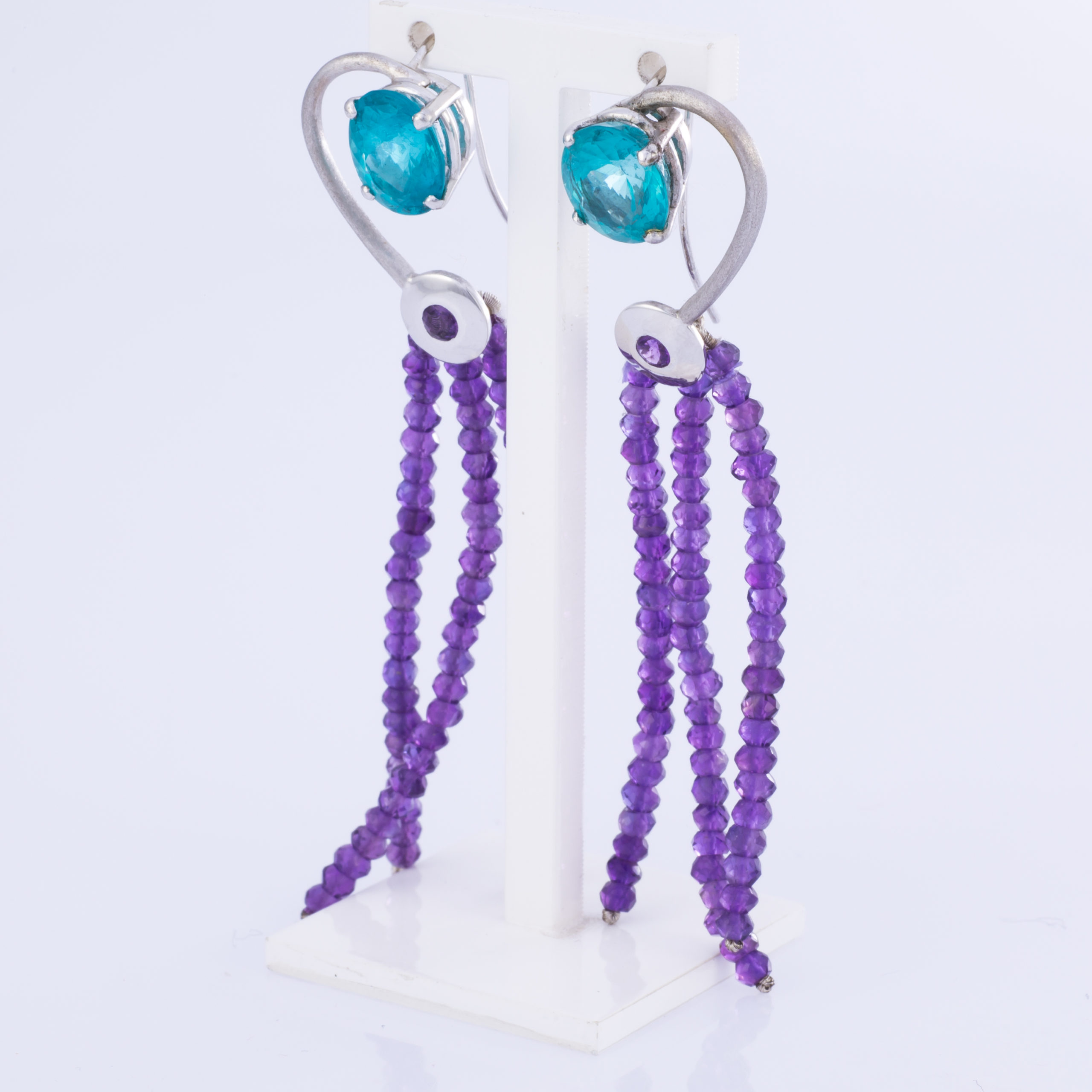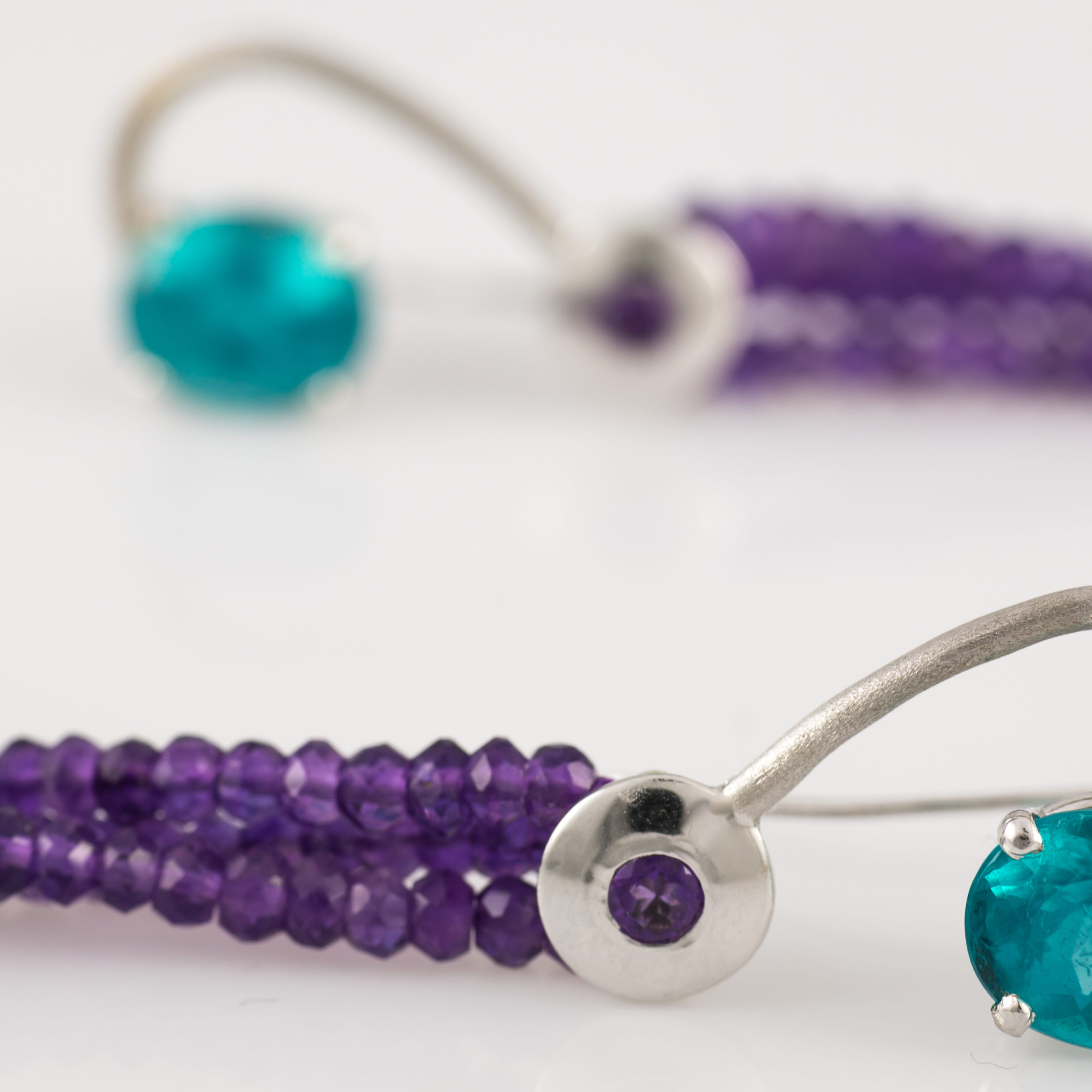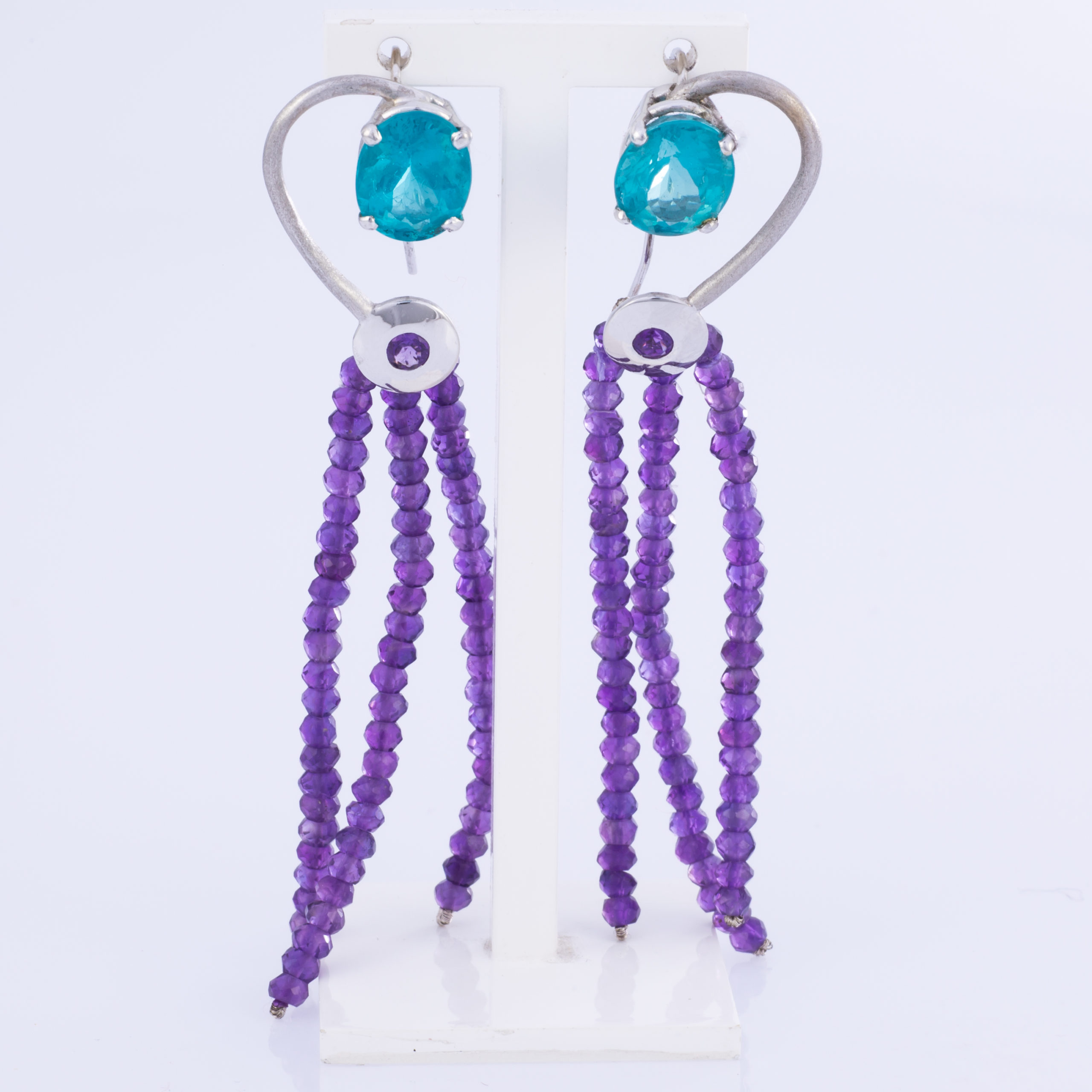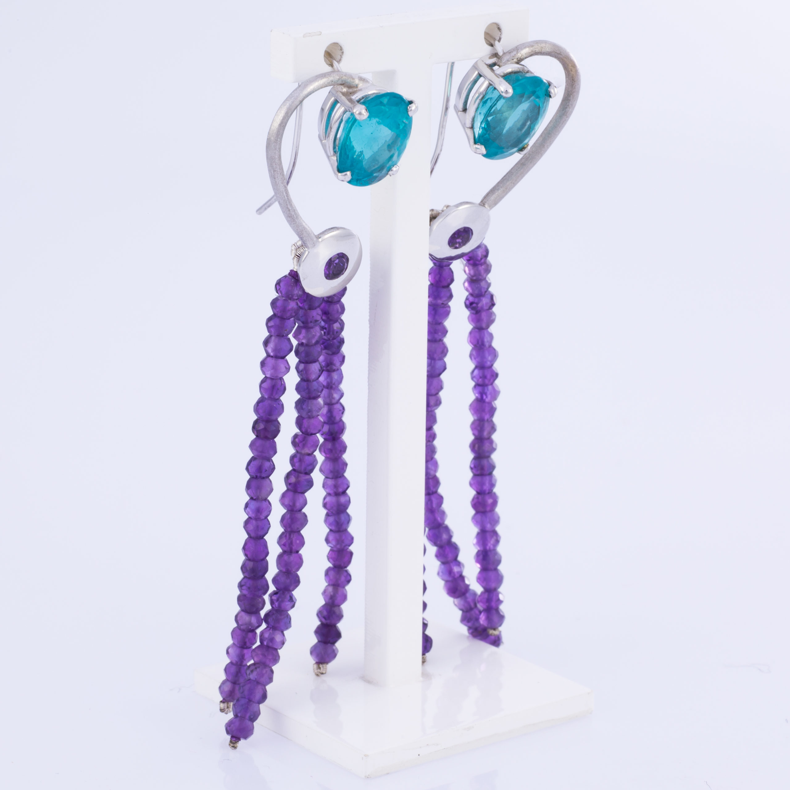 Boucles d’oreilles or gris, apatite ovale sertissage griffe, améthyste sertissage masse ainsi que trois rangs d’améthystes.