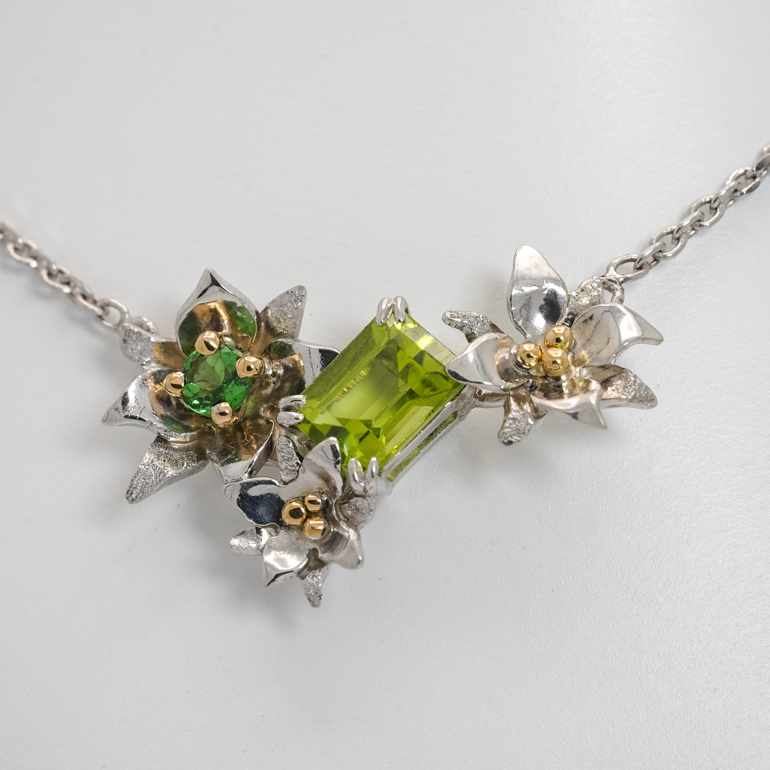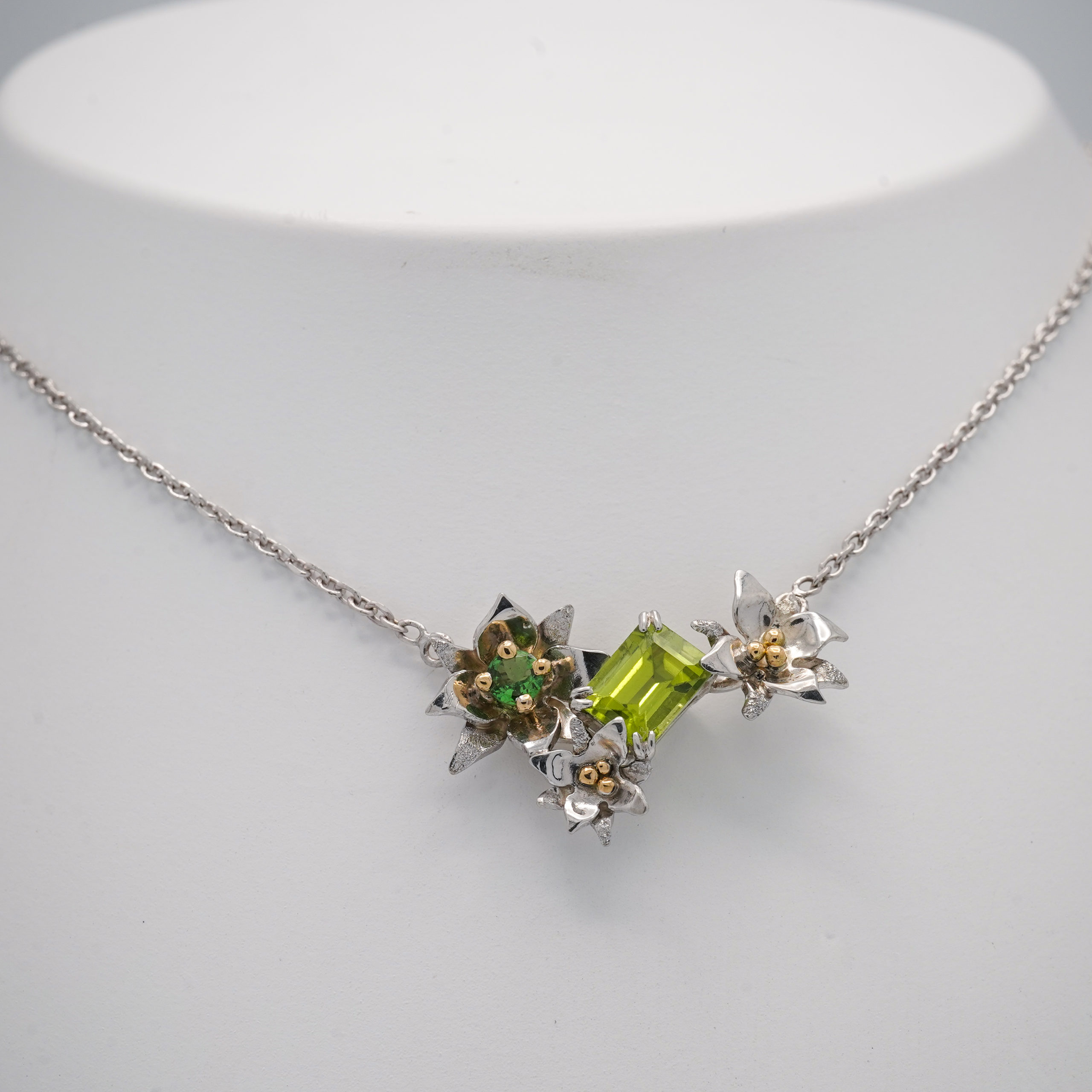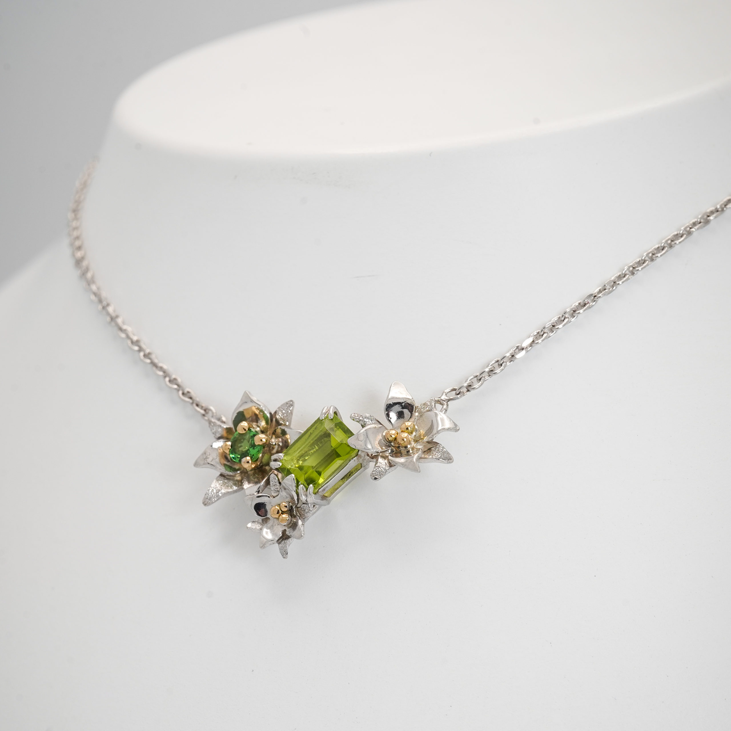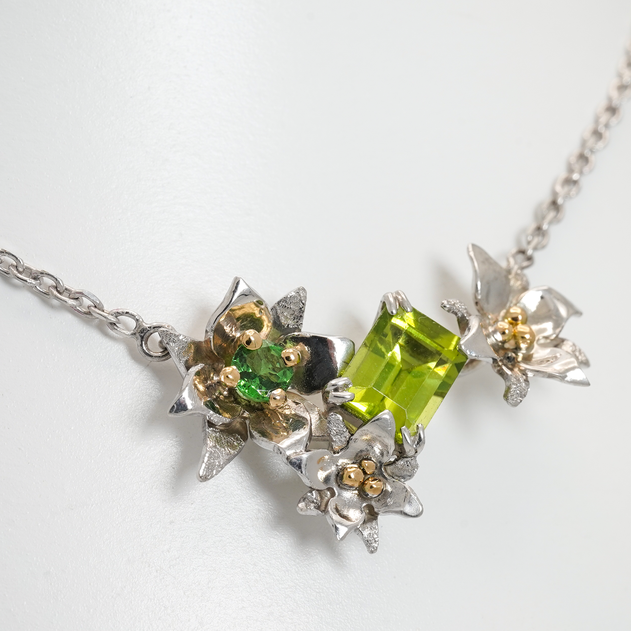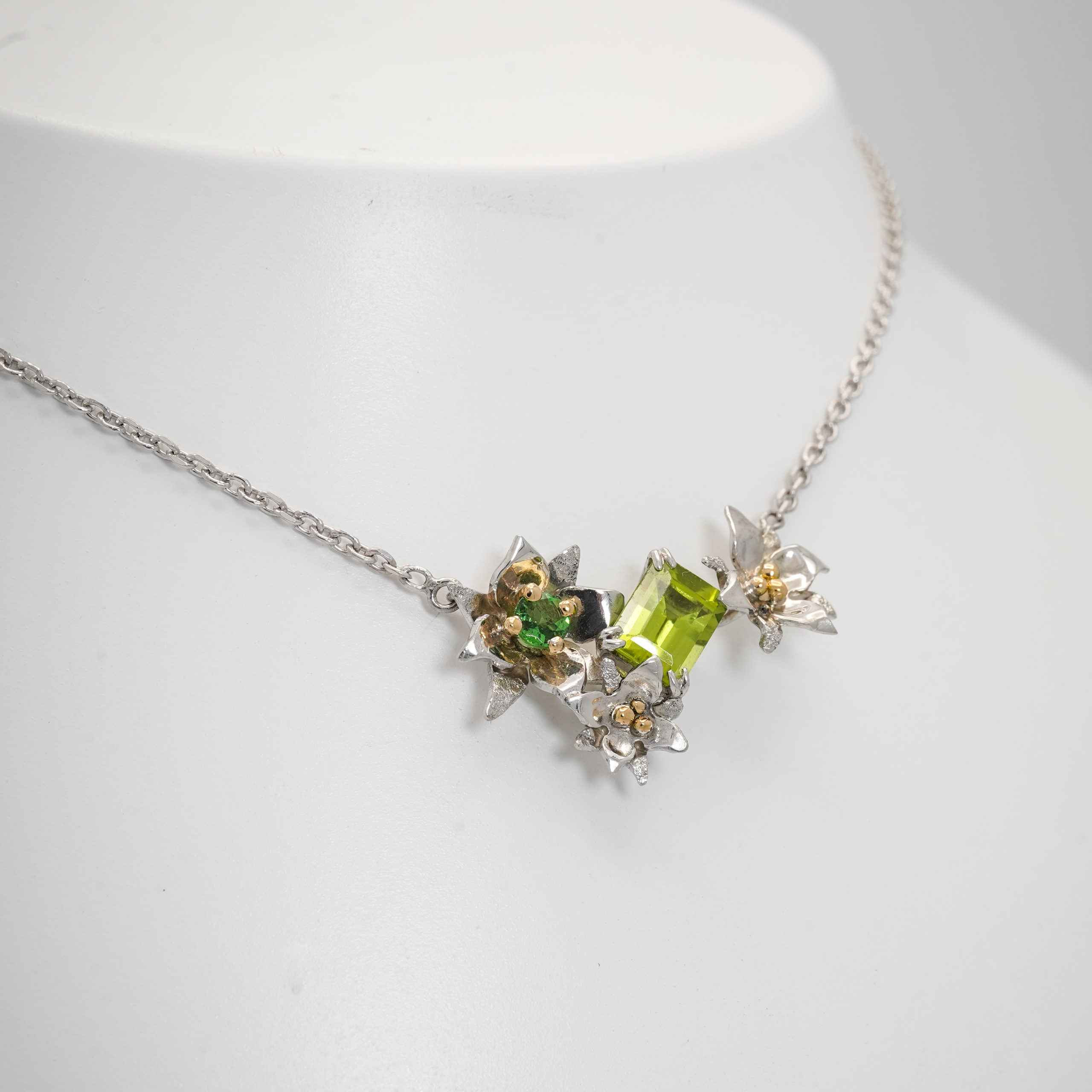 Pendentif en argent et or composé de 3 fleurs avec un péridot et un grenat rond serti griffes