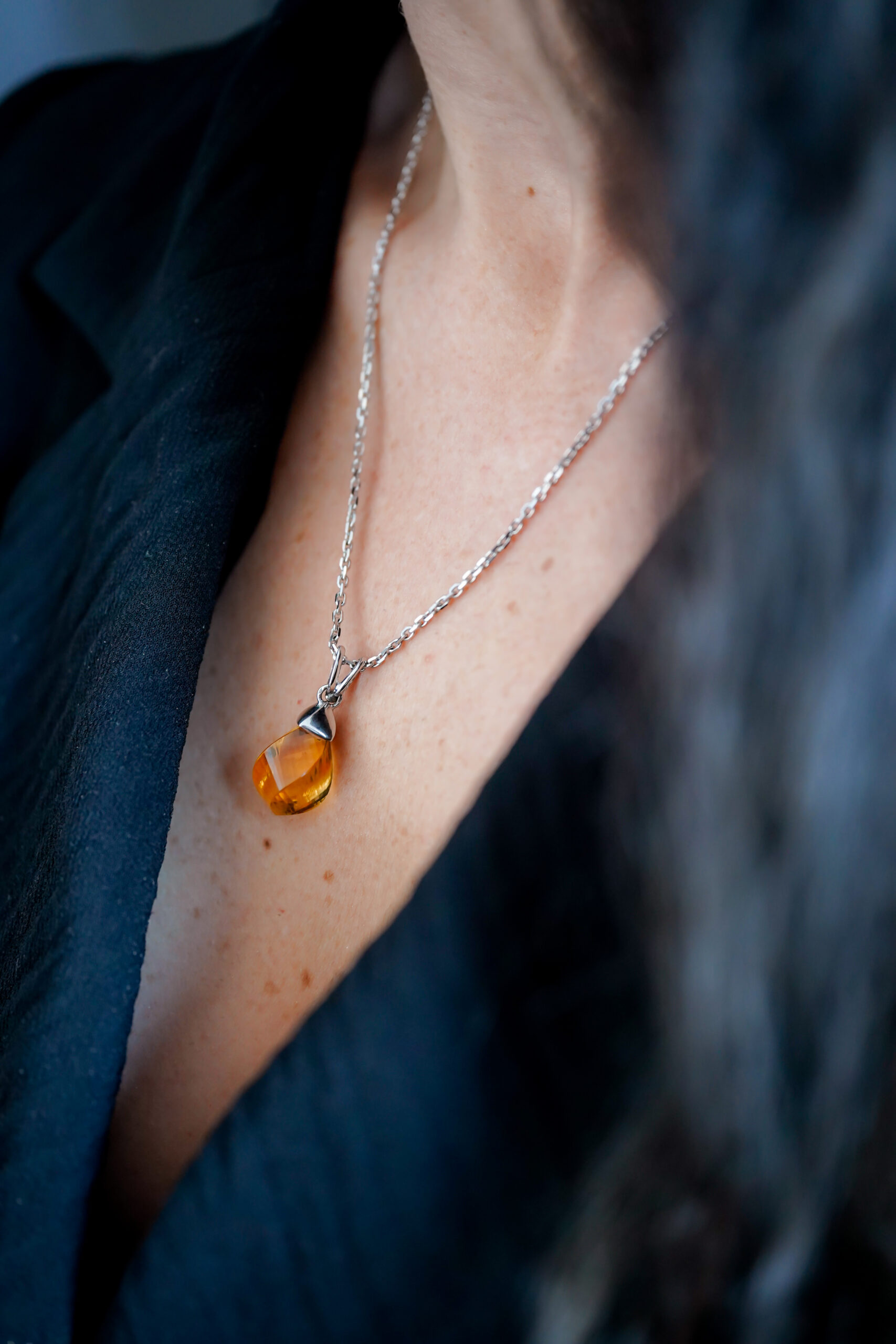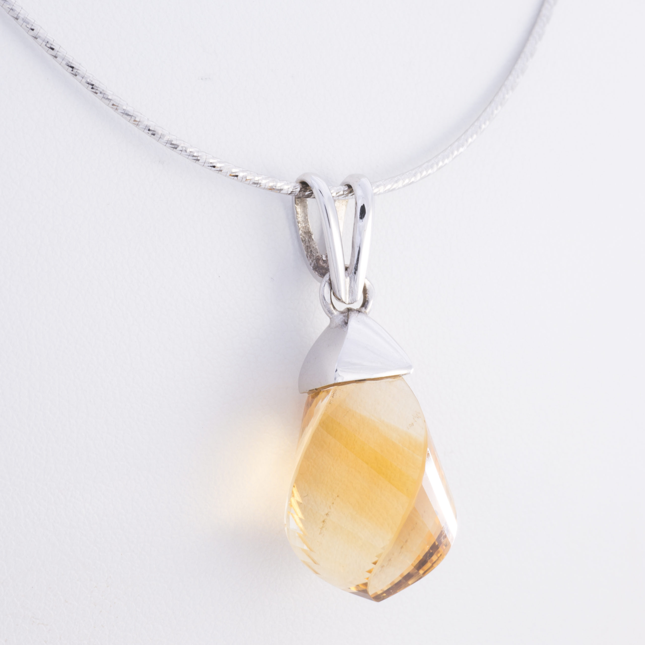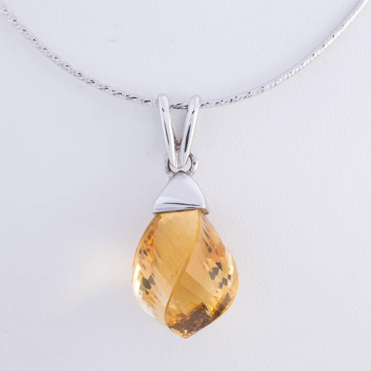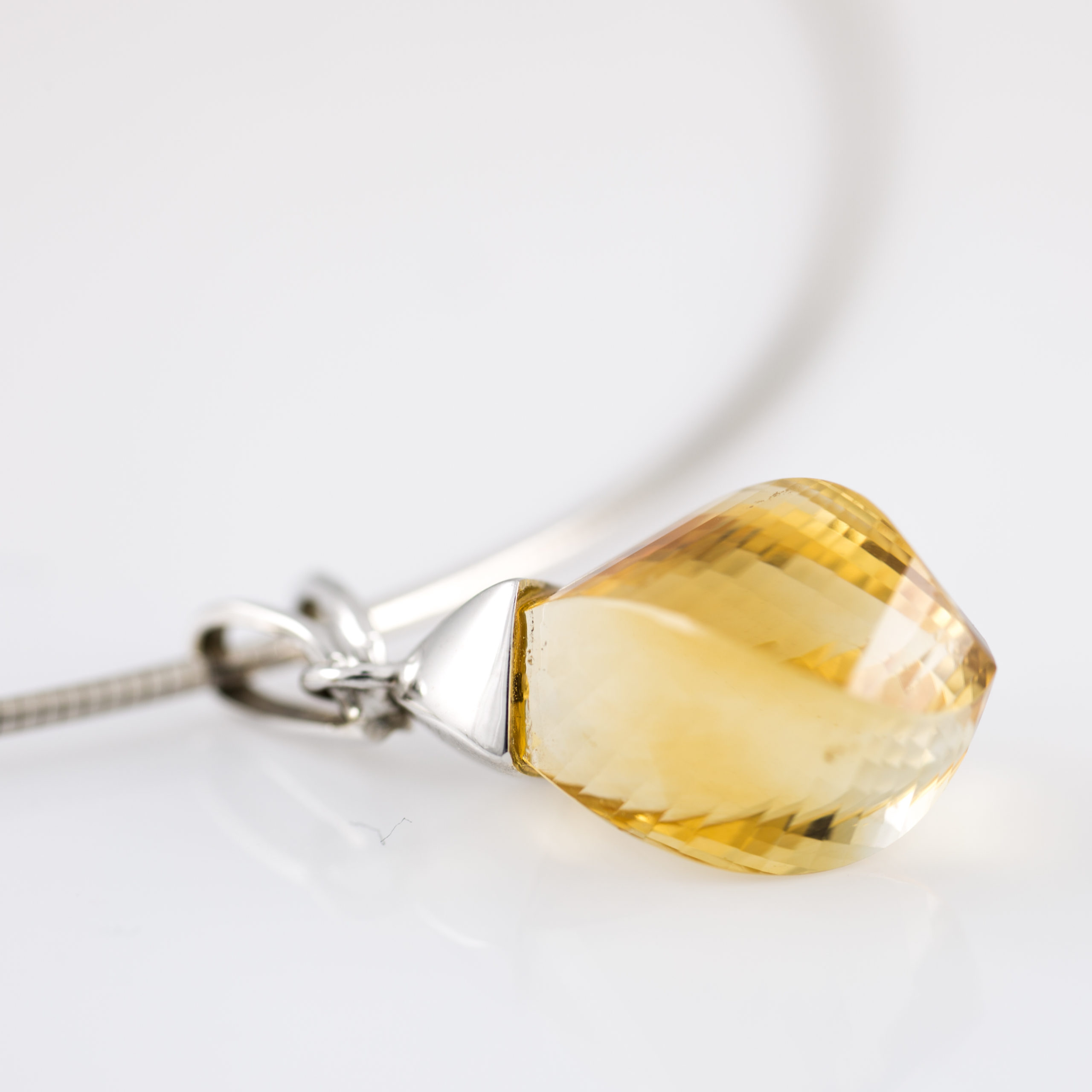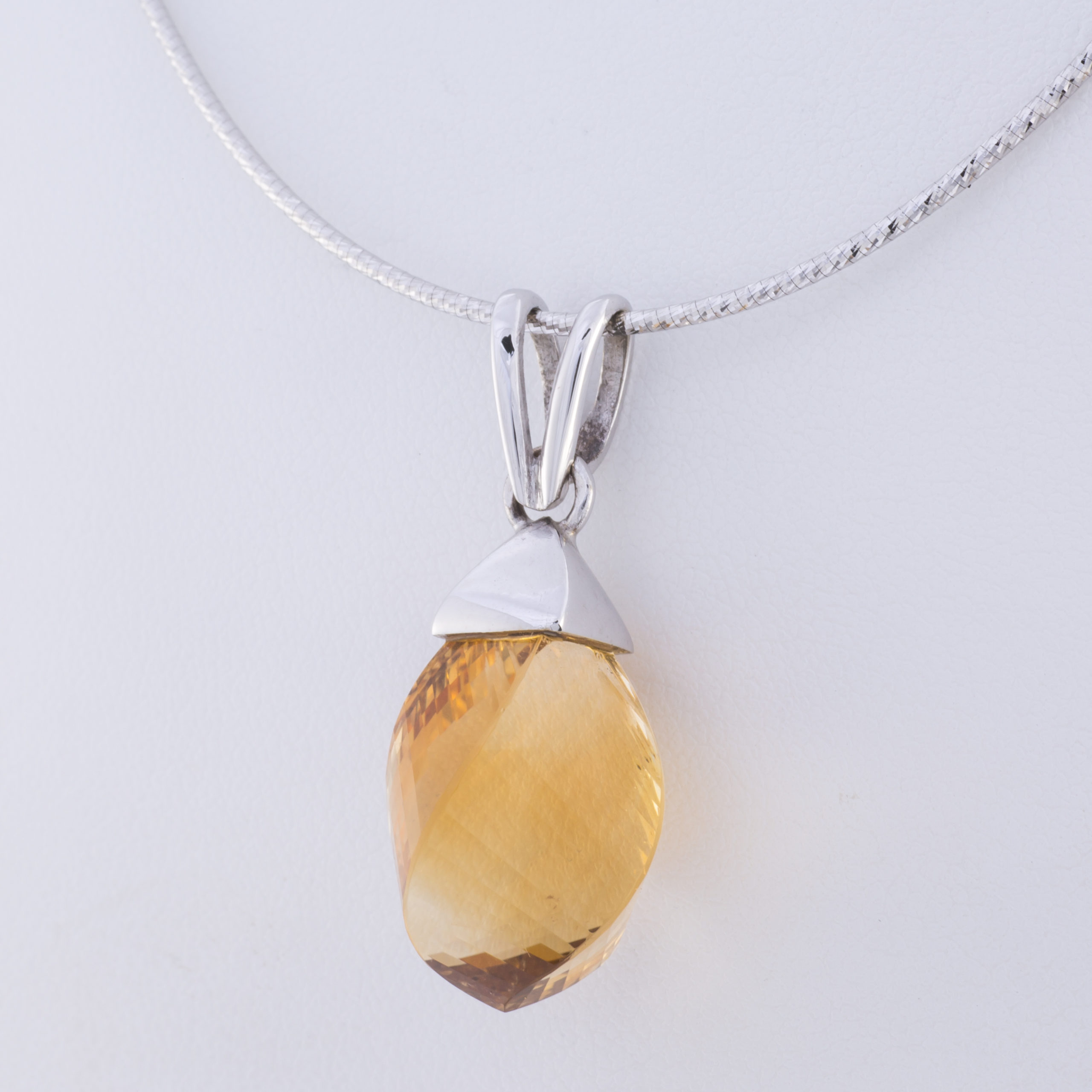 Pendentif or blanc 750 millièmes avec une citrine en forme de goutte brillolette fancy.