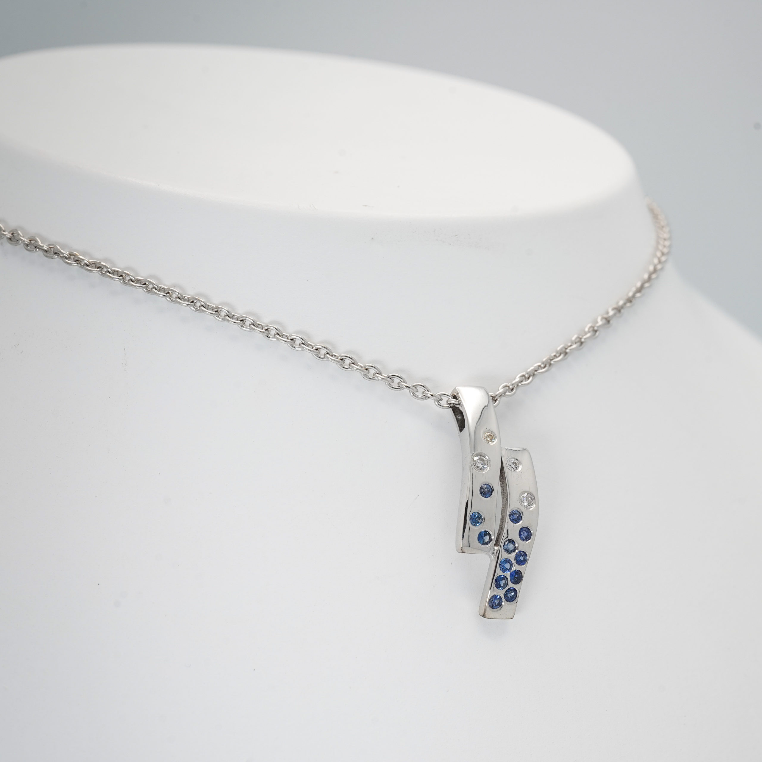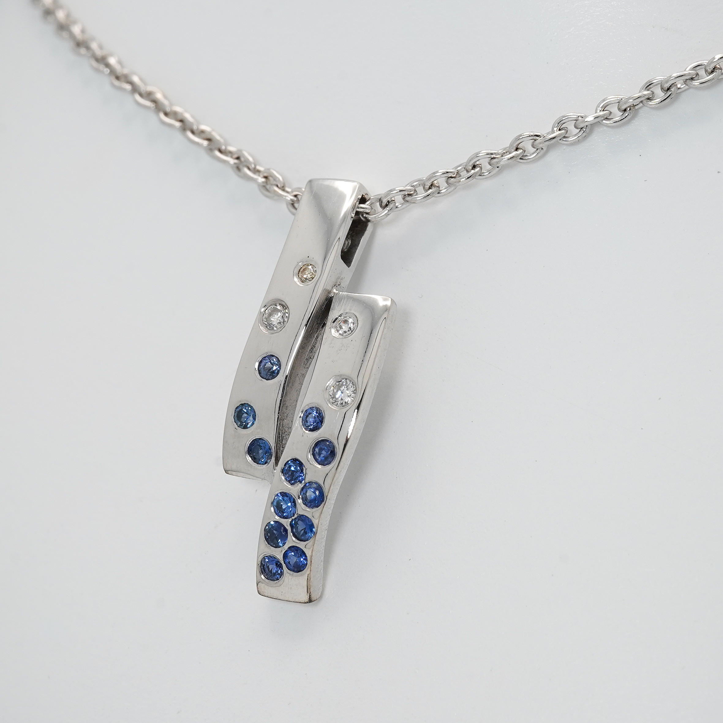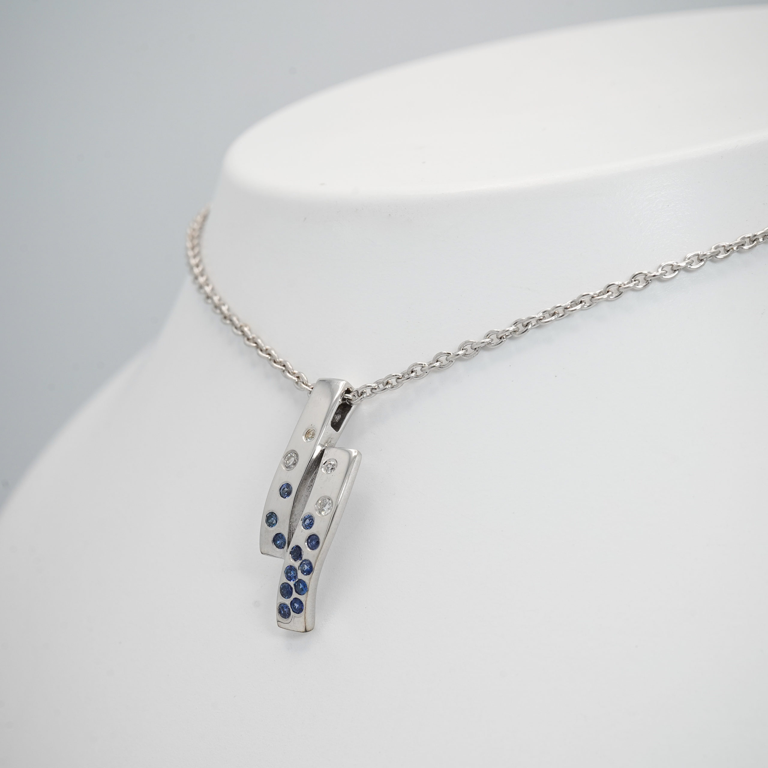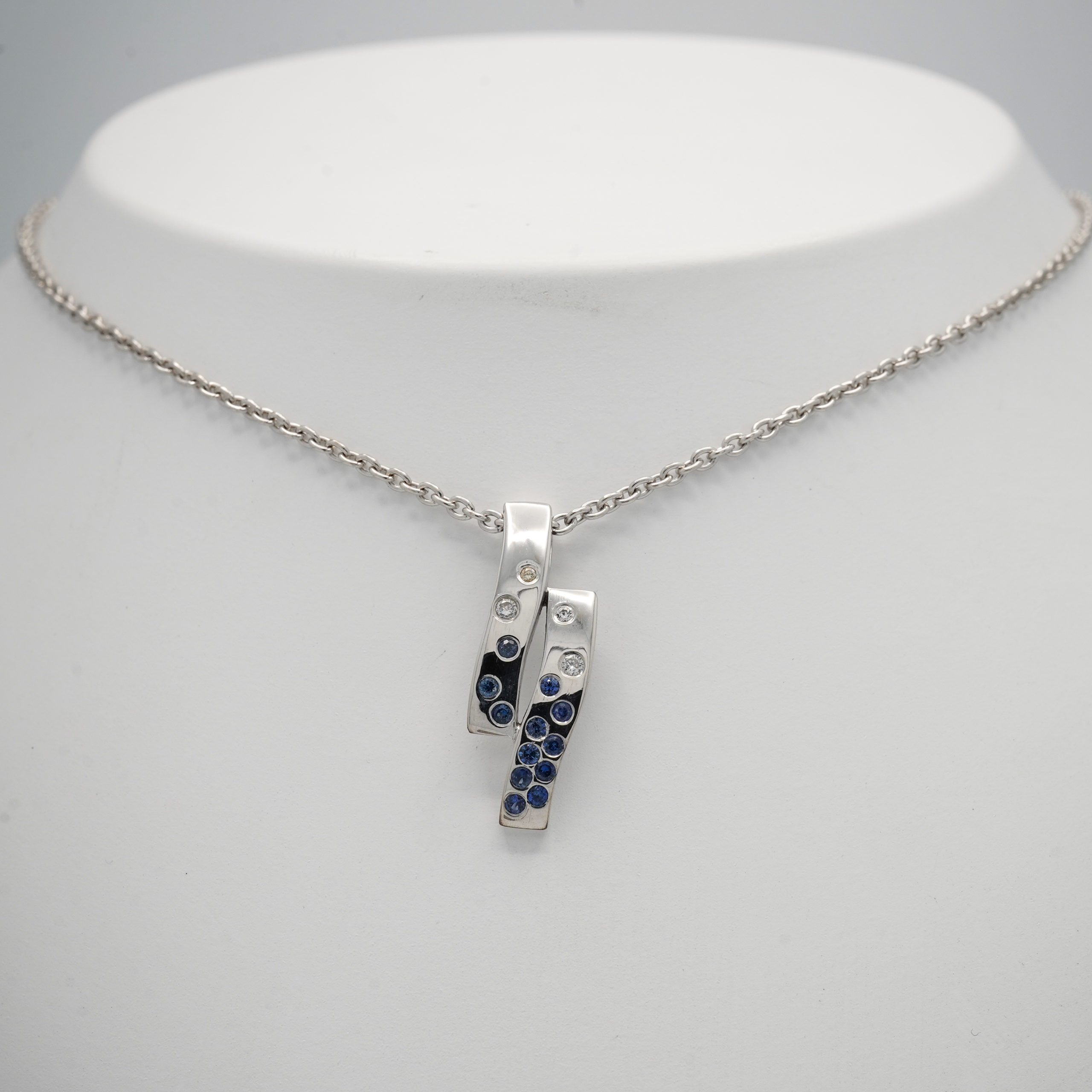 Pendentif en or blanc en deux éléments soudé avec 12 saphirs bleus et 4 diamants serti masse
