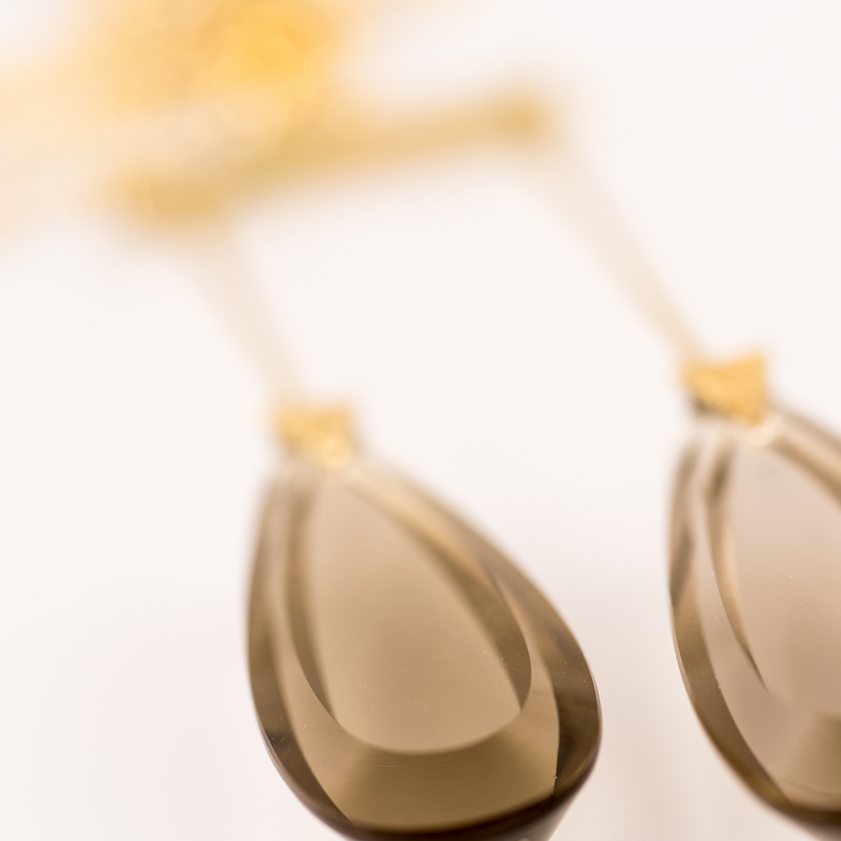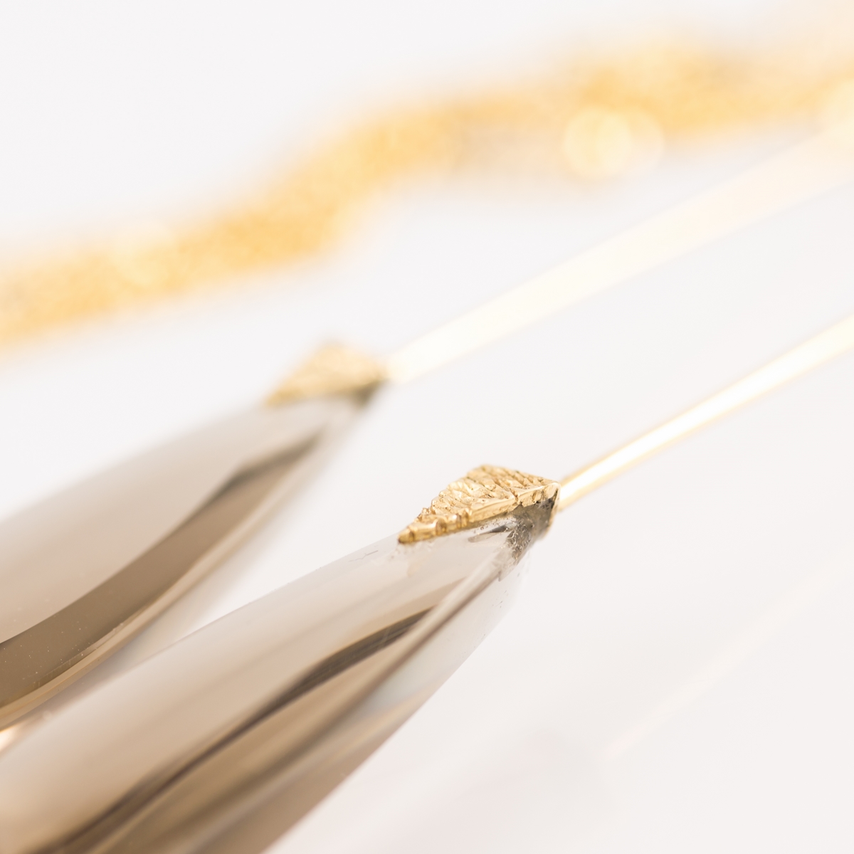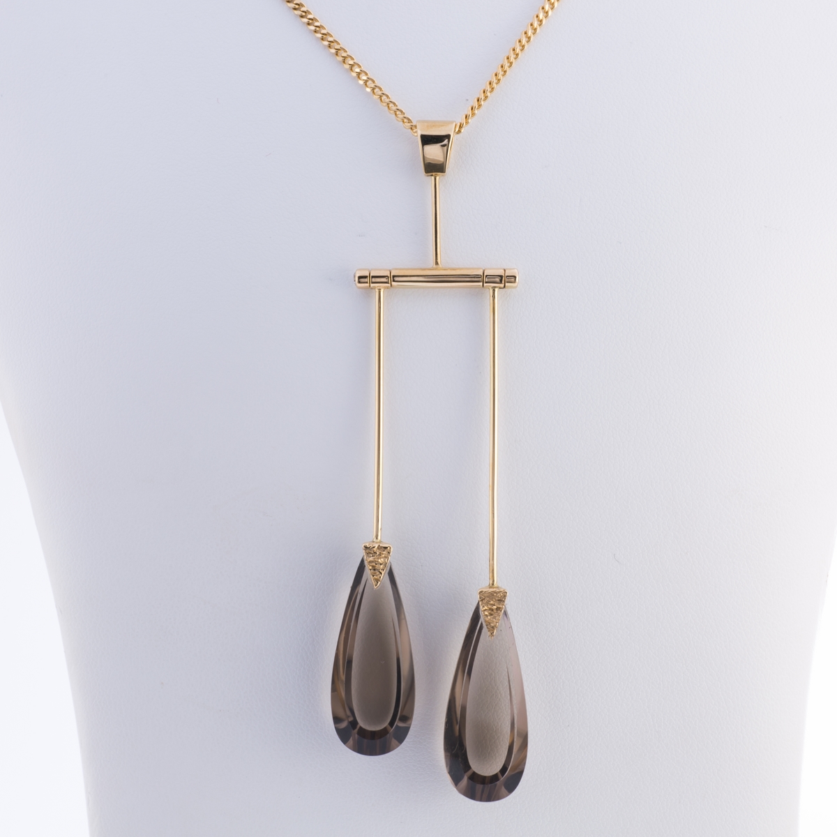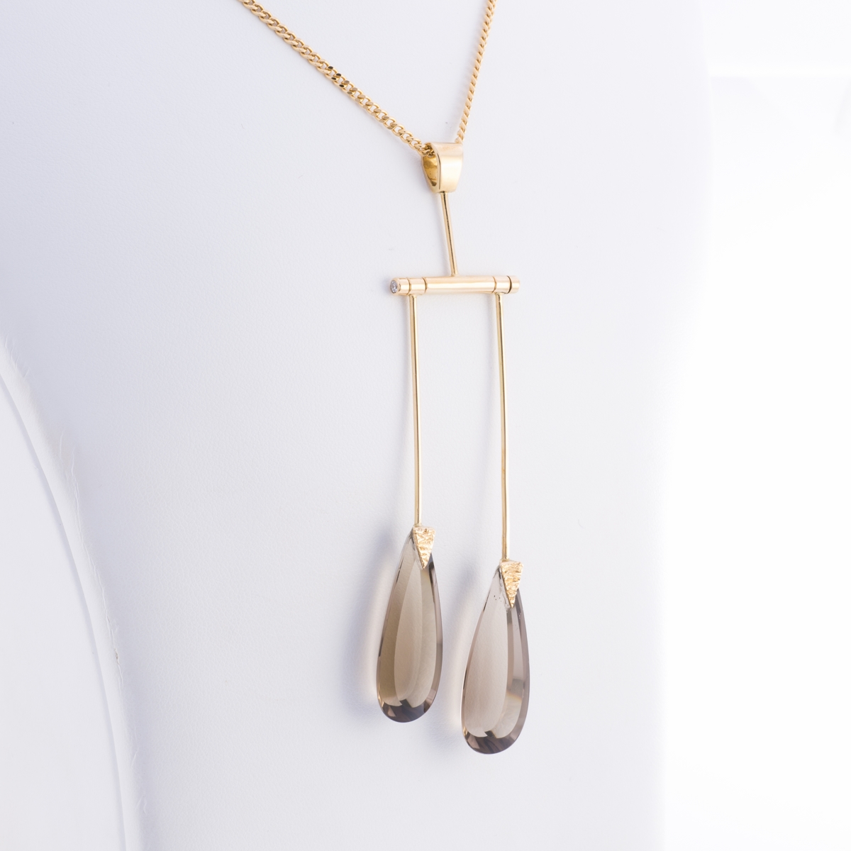 Pendentif or jaune 750 millièmes articulé avec deux quartz fumés en goutte et deux diamants serti clos dans les charnières.