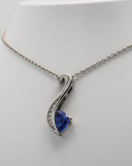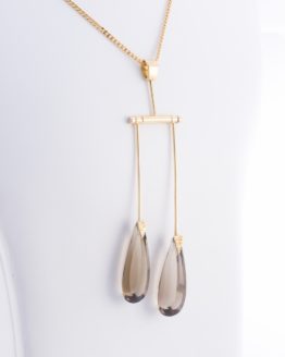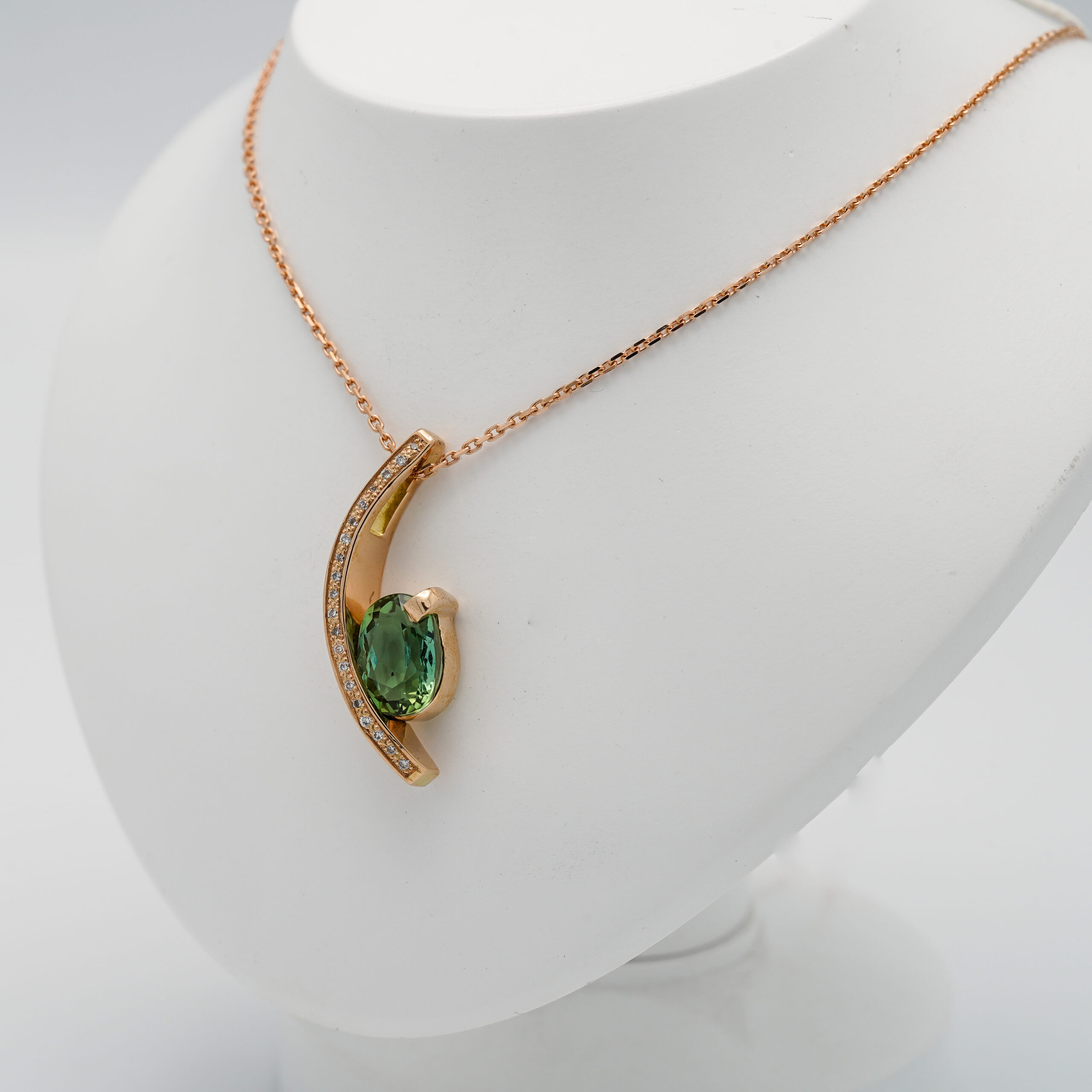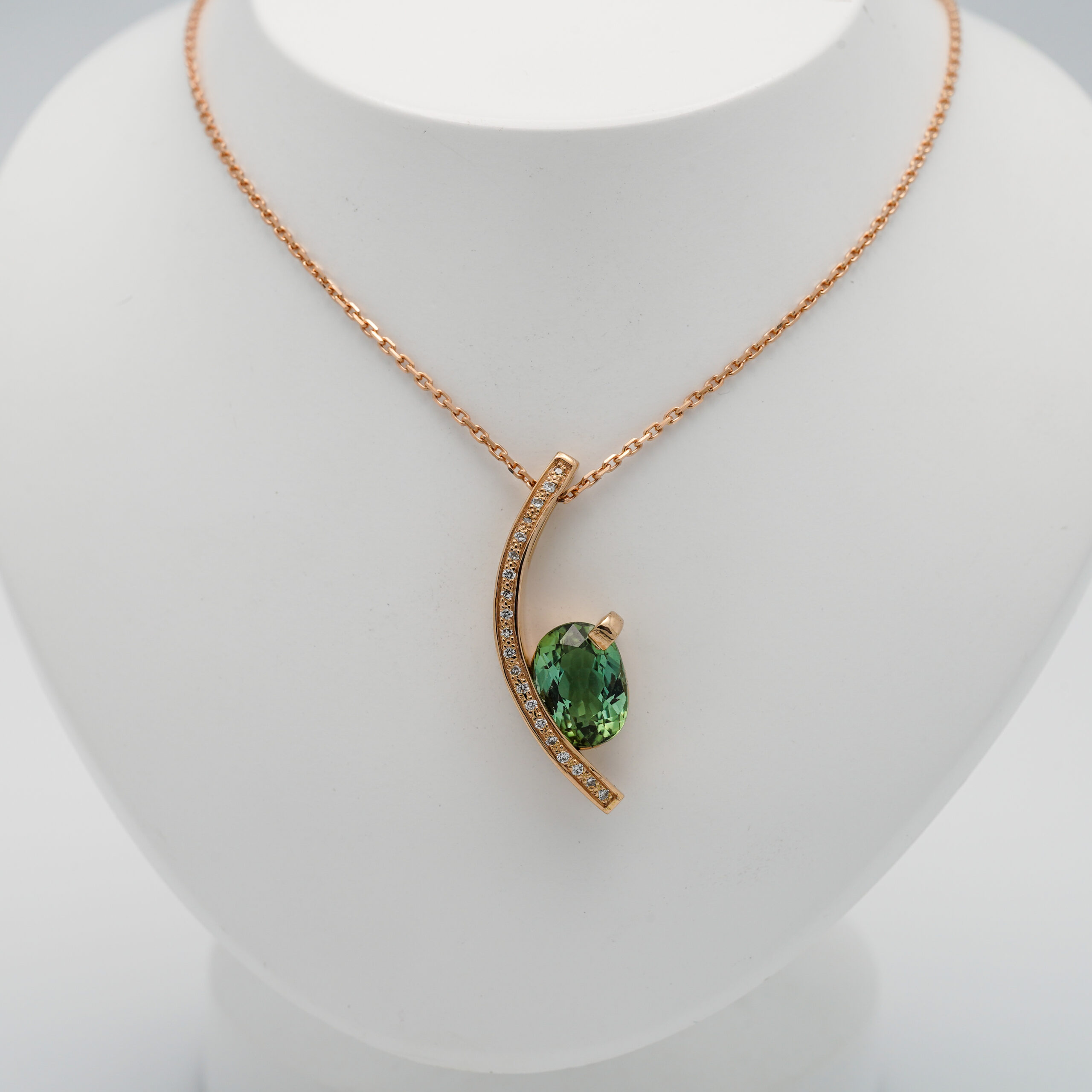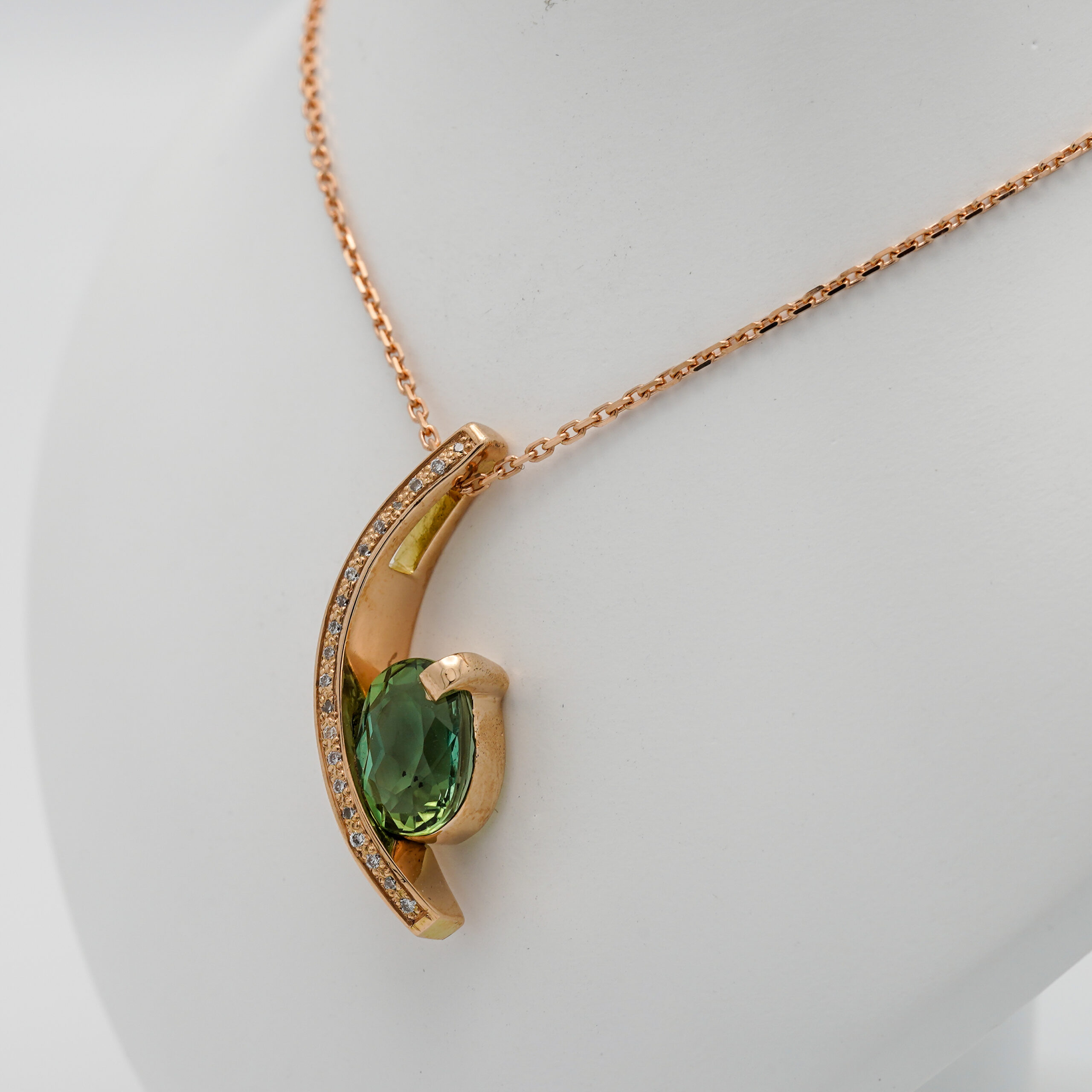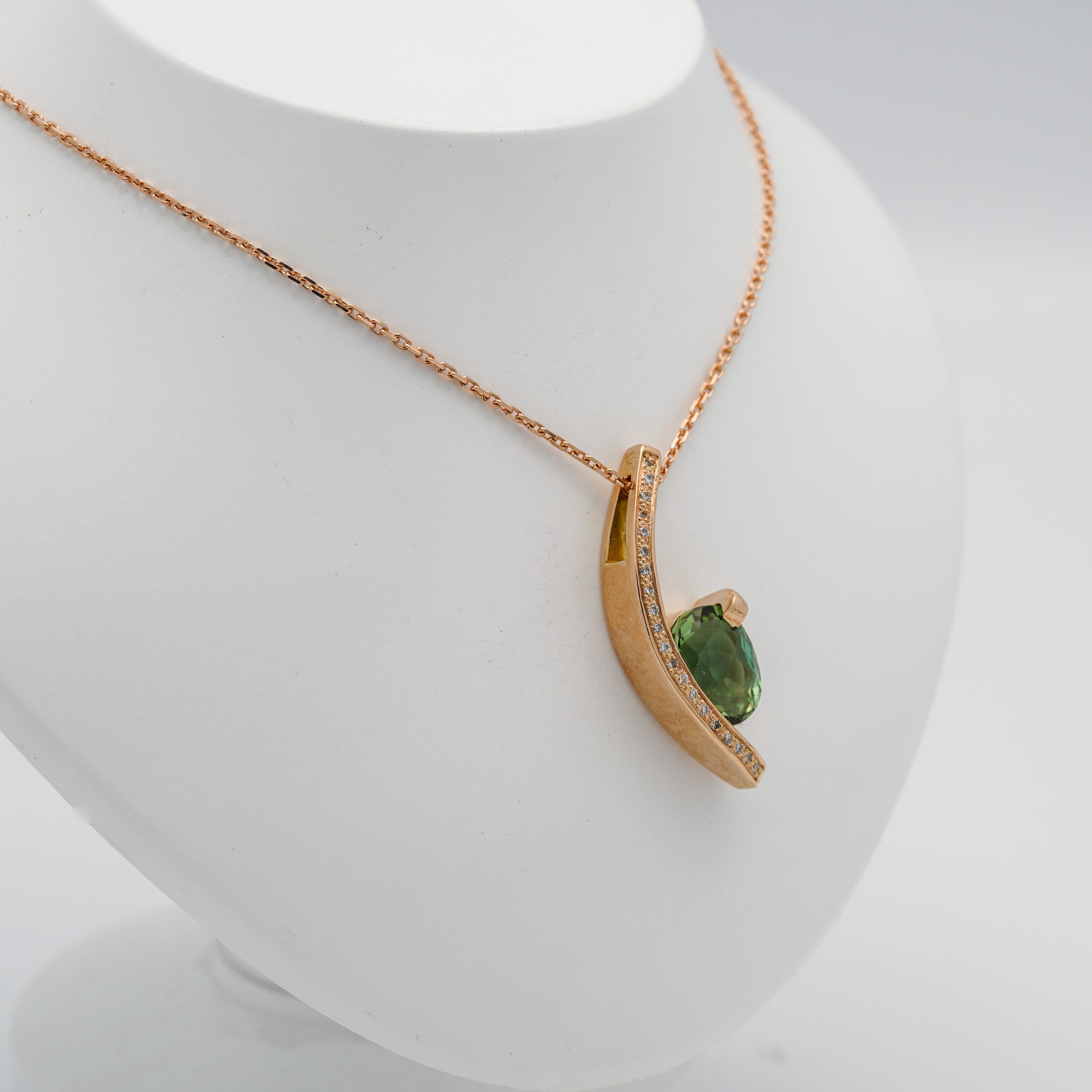 Pendentif en or rose en forme d’arc de cercle avec 20 diamants de 1 mm de diamètre serti en grains sur la tranche et une tourmaline verte serti mi clos et griffes